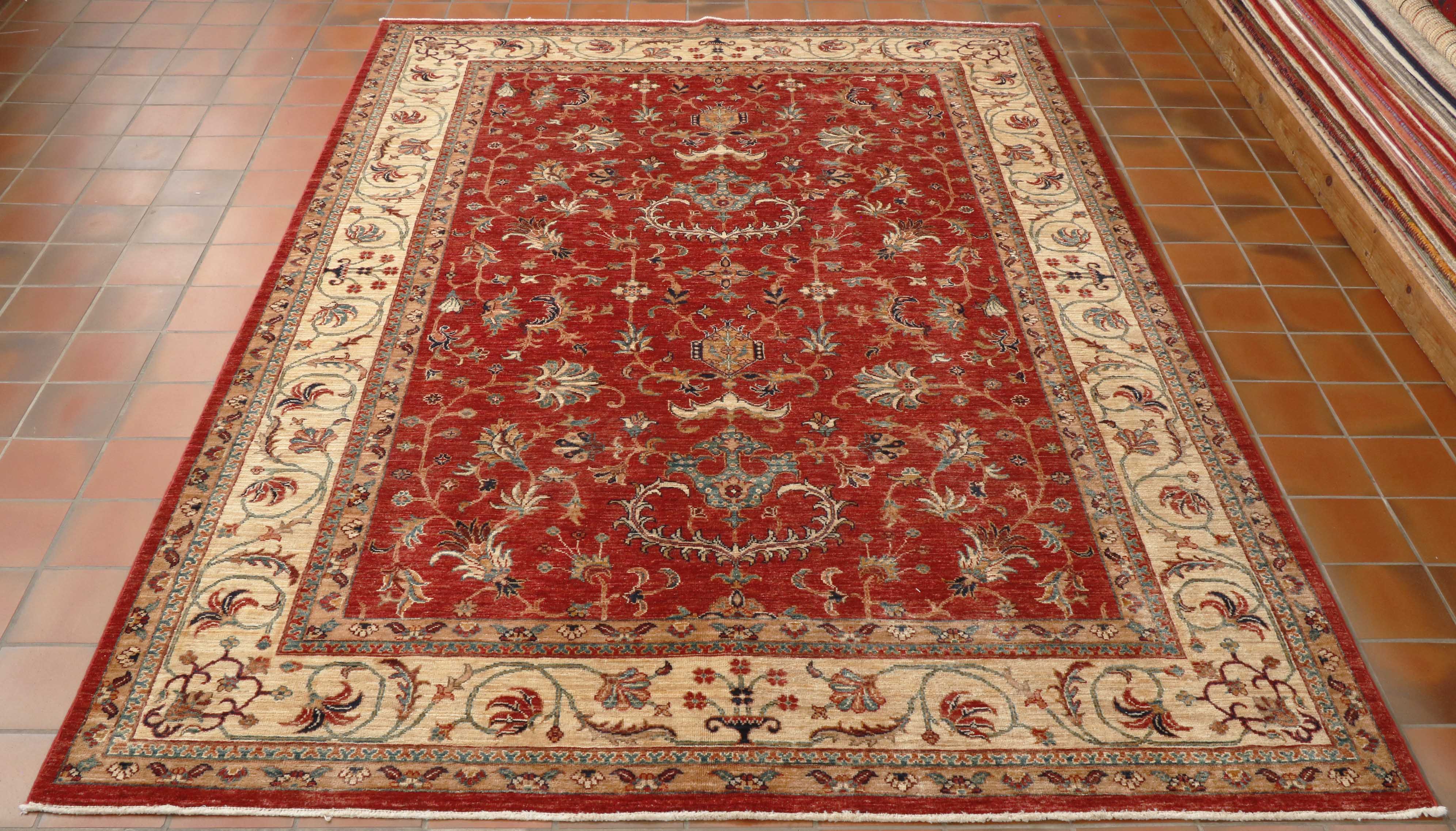 The tomato-red background and cream border make this a light-coloured rug overall, but the red imparts a rich warmth. The classic pattern is pleasing to the eye, featuring a simple curvilinear border. This rug is of superb quality and practical for any room in the home.