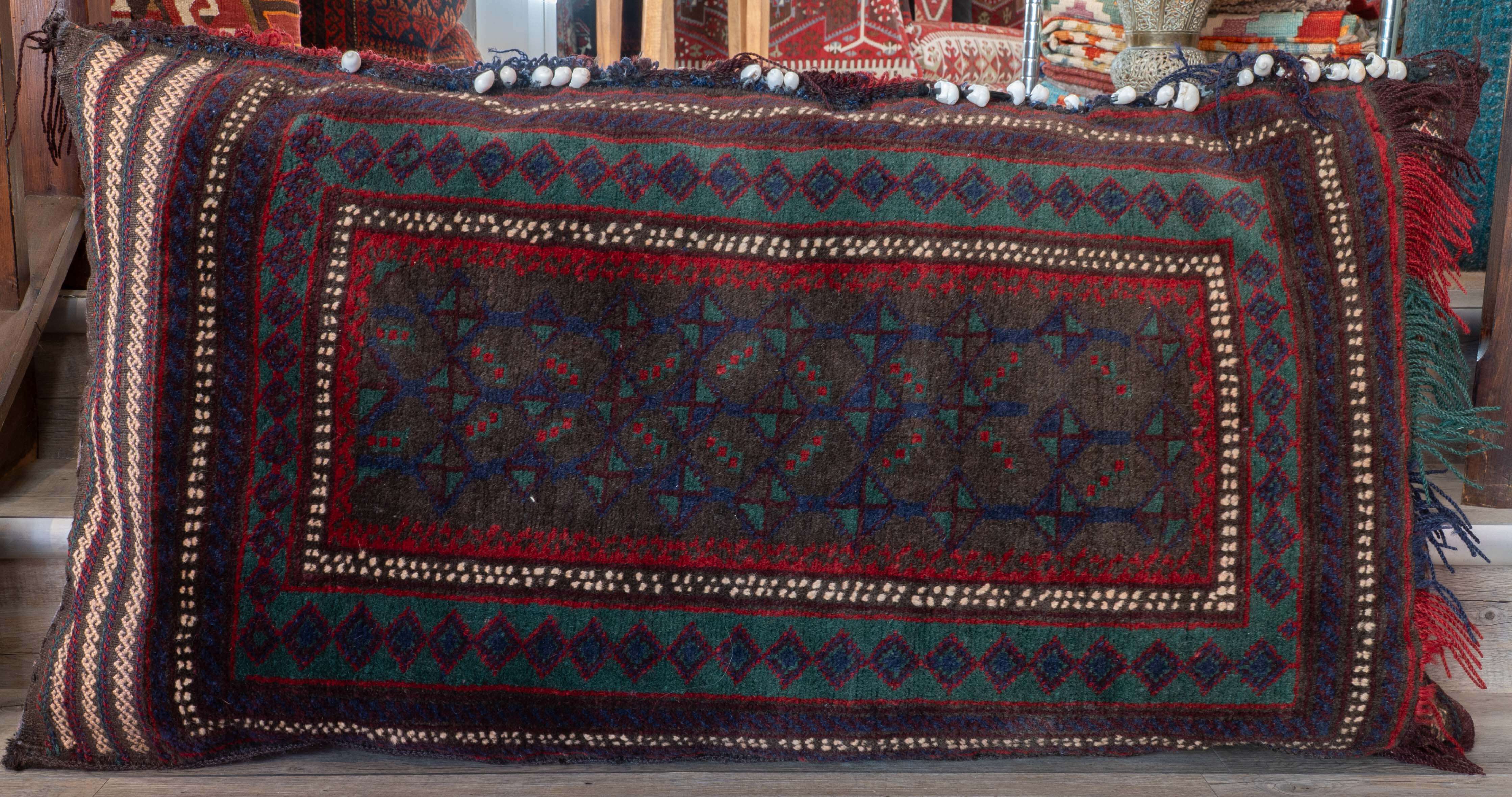 A bolesht bag is a long, narrow bag, usually with a carpet pile on one side and flatweave (kelim) on the reverse. Often, these will be decorated with tassels, beads, buttons and sometimes even shells. Tribal or nomadic people use the bags and normally store their bedding during the day, which also acts as a floor cushion. They are handmade from vegetable-dyed wool and often have loops threaded together and a stick fed through them so the bag does not lose its contents. They are generally in the red and brown colour spectrum, with a traditional design used by that particular tribe.