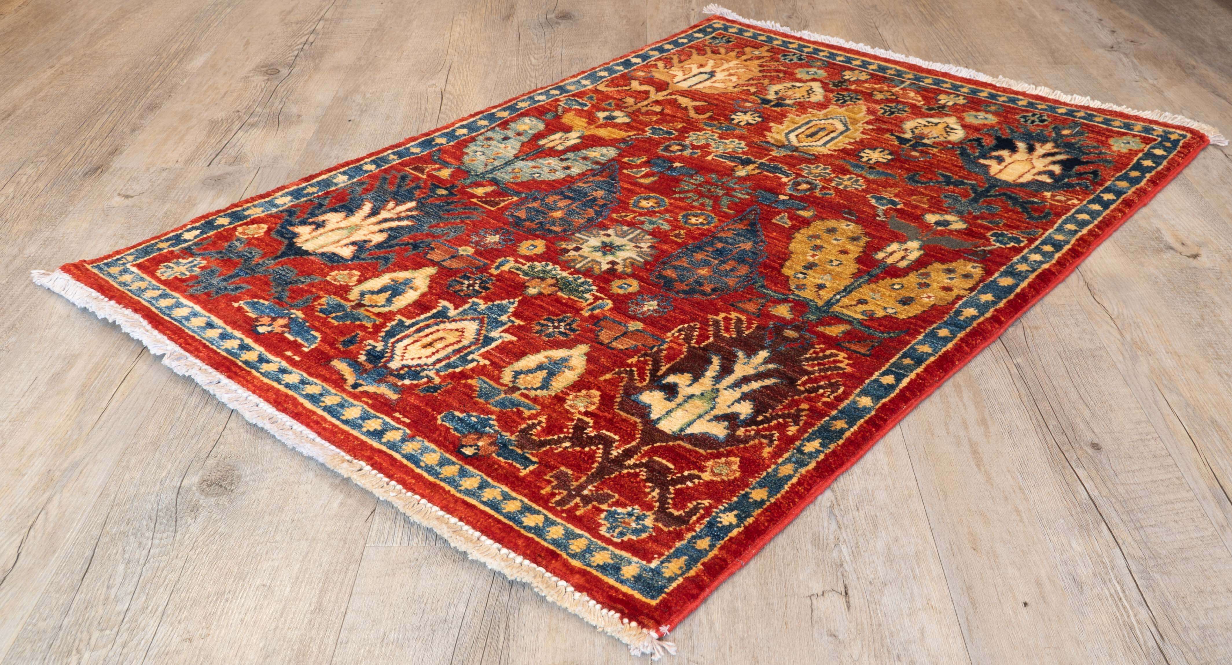 Enhance your living space with this distinctive handmade Afghan Choeb Rang rug, featuring an elegant tree motif that adds character and charm. The harmonious blend of red, blue and gold hues offers subtlety and vibrancy, while the durable wool construction ensures lasting quality and durability. Elevate your décor with a piece that combines artistic uniqueness and enduring craftsmanship, moving beyond the ordinary to bring a sophisticated touch to your home.