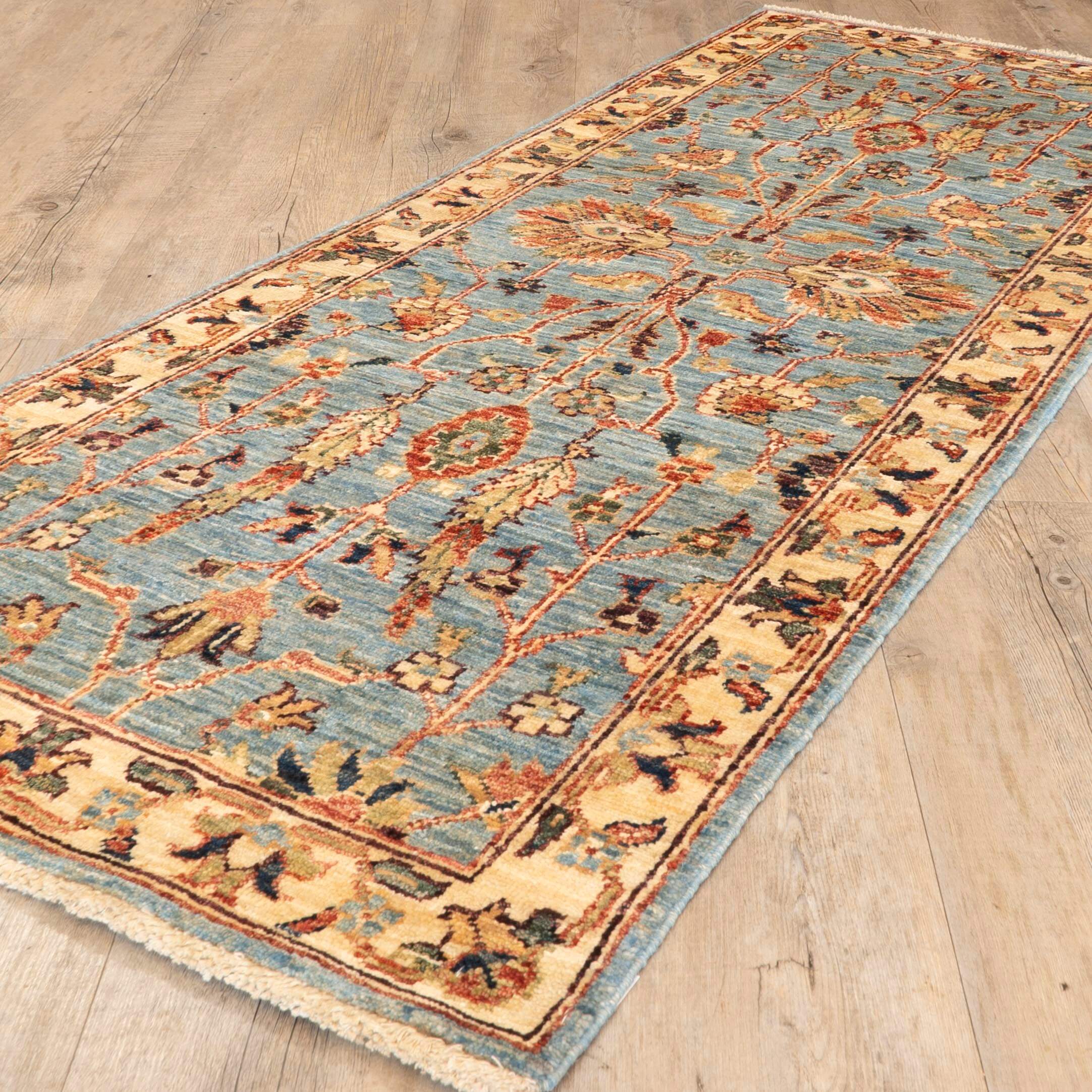 Enhance your living space with this distinctive handmade Afghan Choeb Rang runner rug, featuring a traditional design that adds character and charm. The harmonious blend of gold and blue offers subtlety and vibrancy, while the durable wool construction ensures lasting quality. Elevate your décor with a piece that combines artistic uniqueness and enduring craftsmanship, moving beyond the ordinary to bring a sophisticated touch to your home.