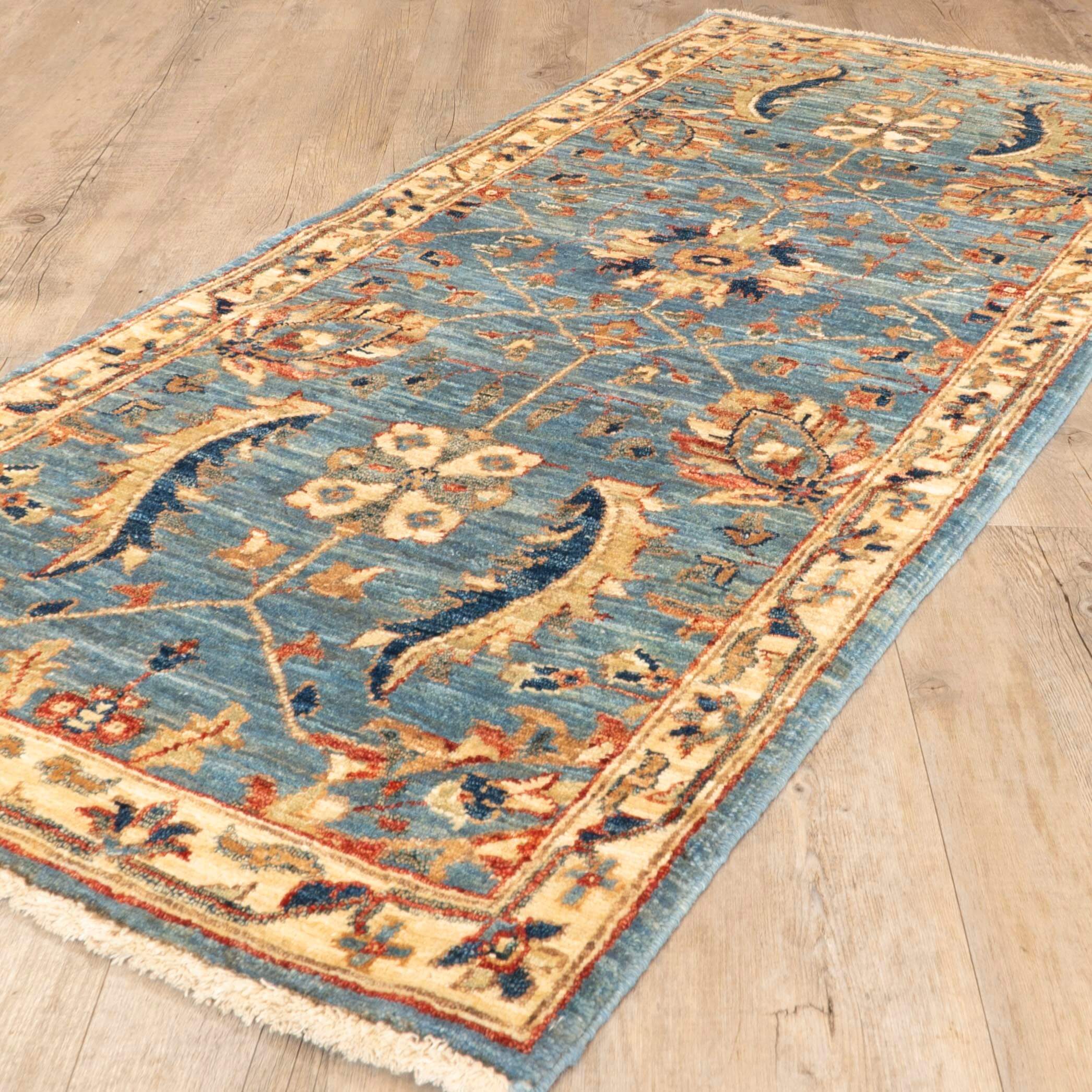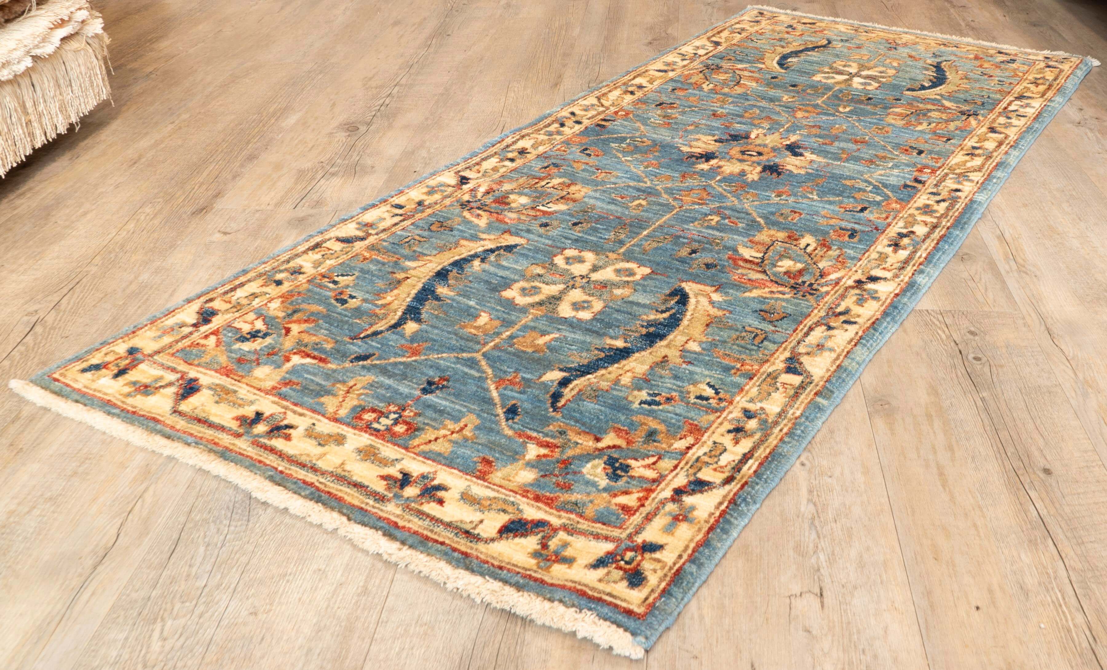 Enhance your living space with this distinctive handmade Afghan Choeb Rang short runner, featuring a pretty design that adds character and charm. The harmonious blend of soft blue and cream offers subtlety, while the durable wool construction ensures lasting quality and durability. Elevate your décor with a piece that combines artistic uniqueness and enduring craftsmanship, moving beyond the ordinary to bring a sophisticated touch to your home.