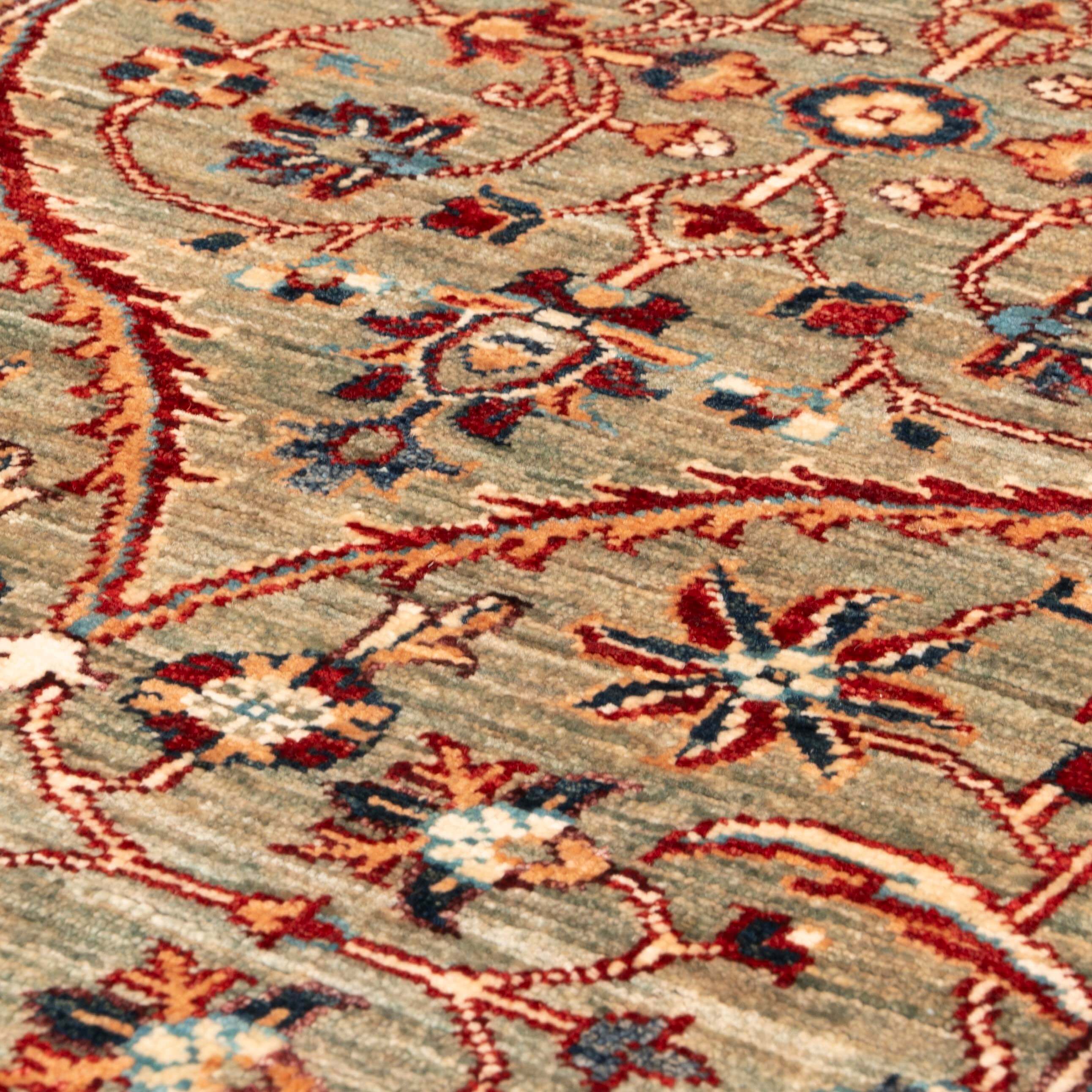 This unique and varied collection is produced in northwest Afghanistan and has a construction similar to that of the Ziegler rugs. The wool is hand-sheared from the indigenous Karukal sheep. It is then hand-spun and coloured using natural vegetable and mineral dyes. These pieces have utilised attractive old Persian designs and patterns from unusual museum pieces. They are generally more vibrant colours and less muted shades. However, the exciting and uplifting colours remain almost Jewel-like. The final finishing processes are carried out in Pakistan, where some post-production occurs, including alignment corrections, surface clipping and tumbling, and the washing mentioned earlier.