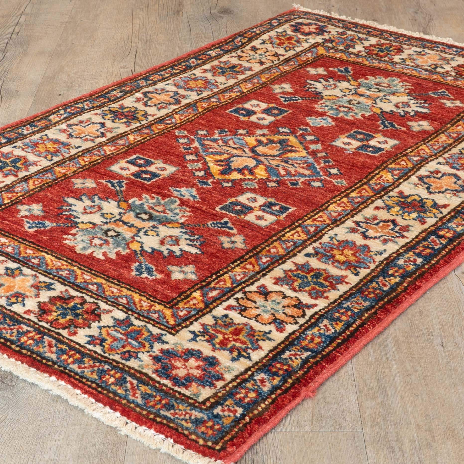 Although Kazaks are hand-knotted in Afghanistan, the design originates from the Caucasus. The short pile emphasises the sharpness of the pattern. Each piece is crafted from exceptional Afghan wool, typically spun in Ghazni. Afghan wool is generally slightly coarser and more curly than other wools, making it perfect for carpet weaving. Afghan Kazak carpets are traditionally made with bold geometric designs in intense, vibrant colours such as rich reds, warm terracottas, and shades of blues with soft golds and creams.