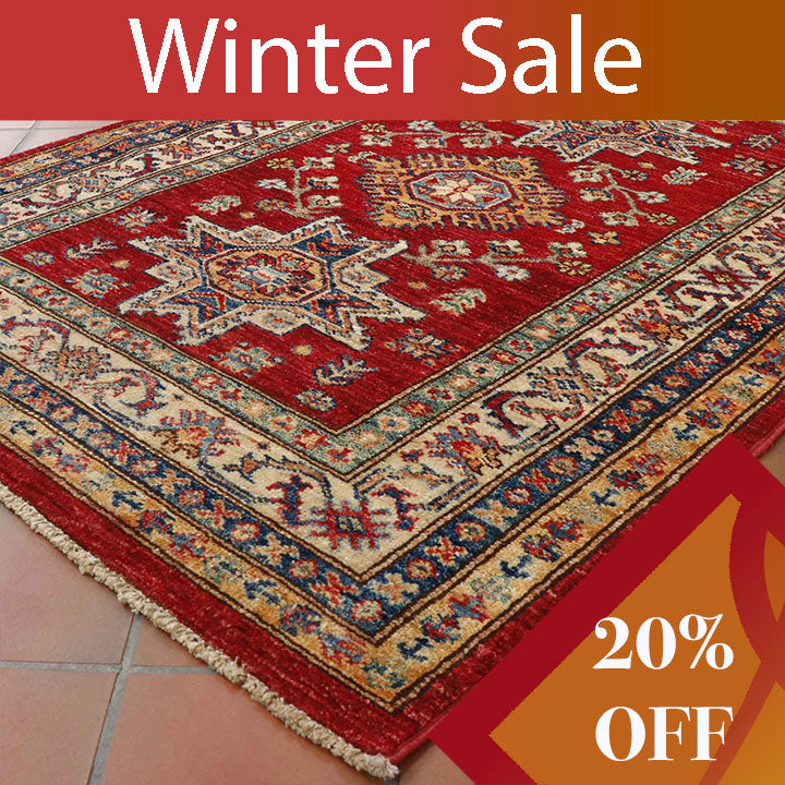 Although Kazaks are hand-knotted in Afghanistan, the design originates from the Caucasus. The short pile emphasises the sharpness of the pattern. Each piece is made using excellent Afghan wool, usually spun in Ghazni. Afghan wool is generally slightly coarser and curlier than other wools, making it ideal for carpet weaving. Afghan Kazak carpets are traditionally made with bold geometric designs in intense, vibrant colours such as rich reds, warm terracottas, and shades of blues with soft golds and creams.