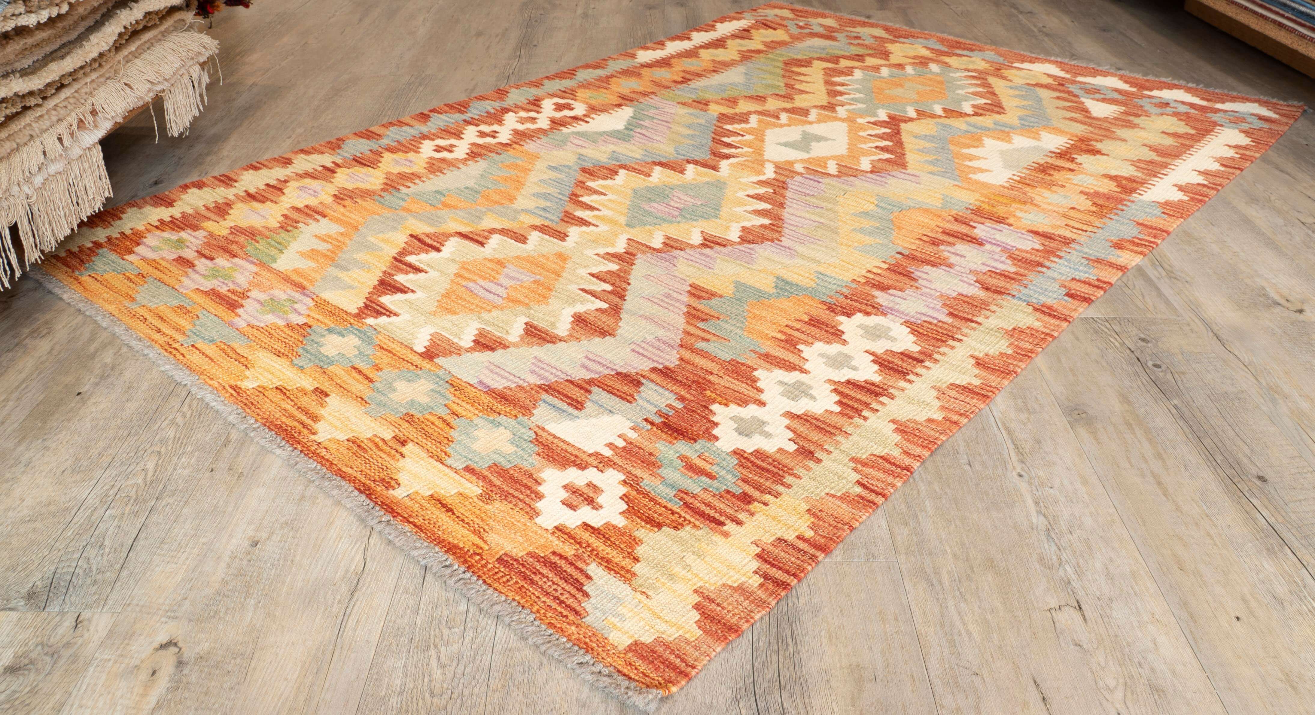 Experience the quality and tradition of Afghan craftsmanship with our handmade Kilim in sft muted tones. This flat-weave kilim is woven from traditional, vegetable-dyed wool, making it durable and ideal for use with underfloor heating. Its colourful and striking design is reversible, allowing it to be used as a floor covering, wall hanging, or throw. Upgrade your space with this beautiful and inexpensive piece.