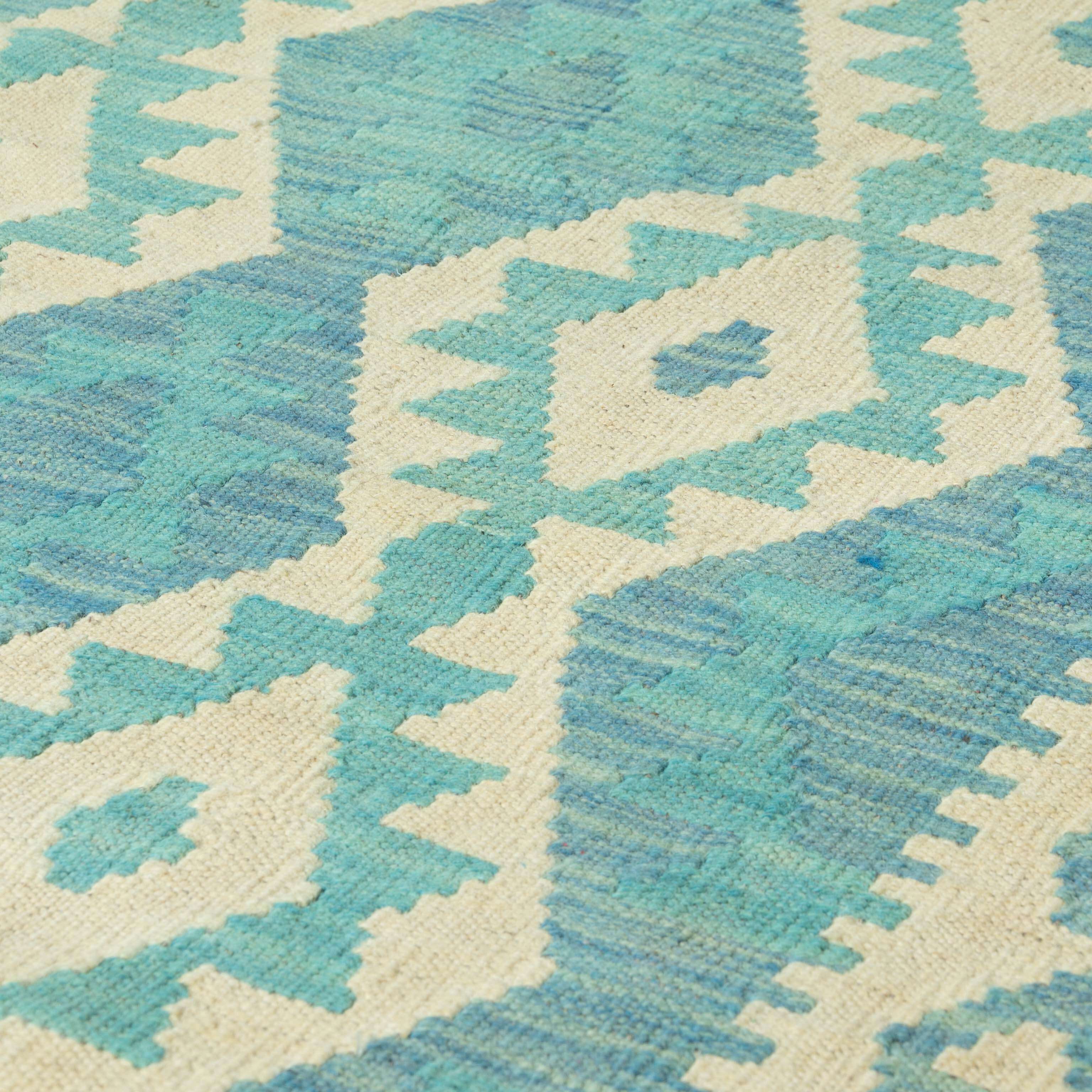 Experience the quality and tradition of Afghan craftsmanship with our large, handmade, blue-and-cream Kilim. This flat-weave kilim is woven from traditional, vegetable-dyed wool, making it durable and ideal for use with underfloor heating. Its colourful and striking design is reversible, allowing it to be used as a floor covering, wall hanging, or throw. Elevate your space with this stunning and affordable piece.