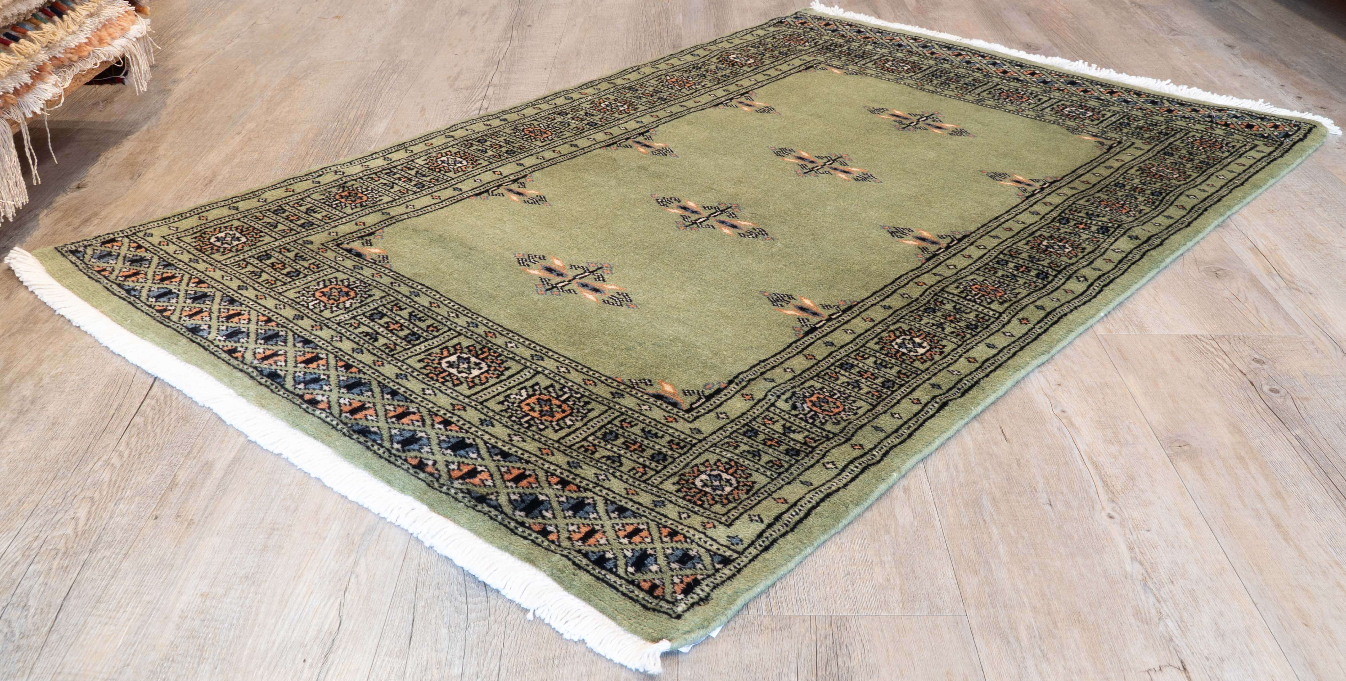 This Pakistan Bokhara rug is finely knotted in a traditional design using lovely, soft, silky wool. The Bokhara rugs are always made with a wool pile, but unfortunately, some people try to pass them off as silk. Handmade Bokhara rugs are incredibly good value.
