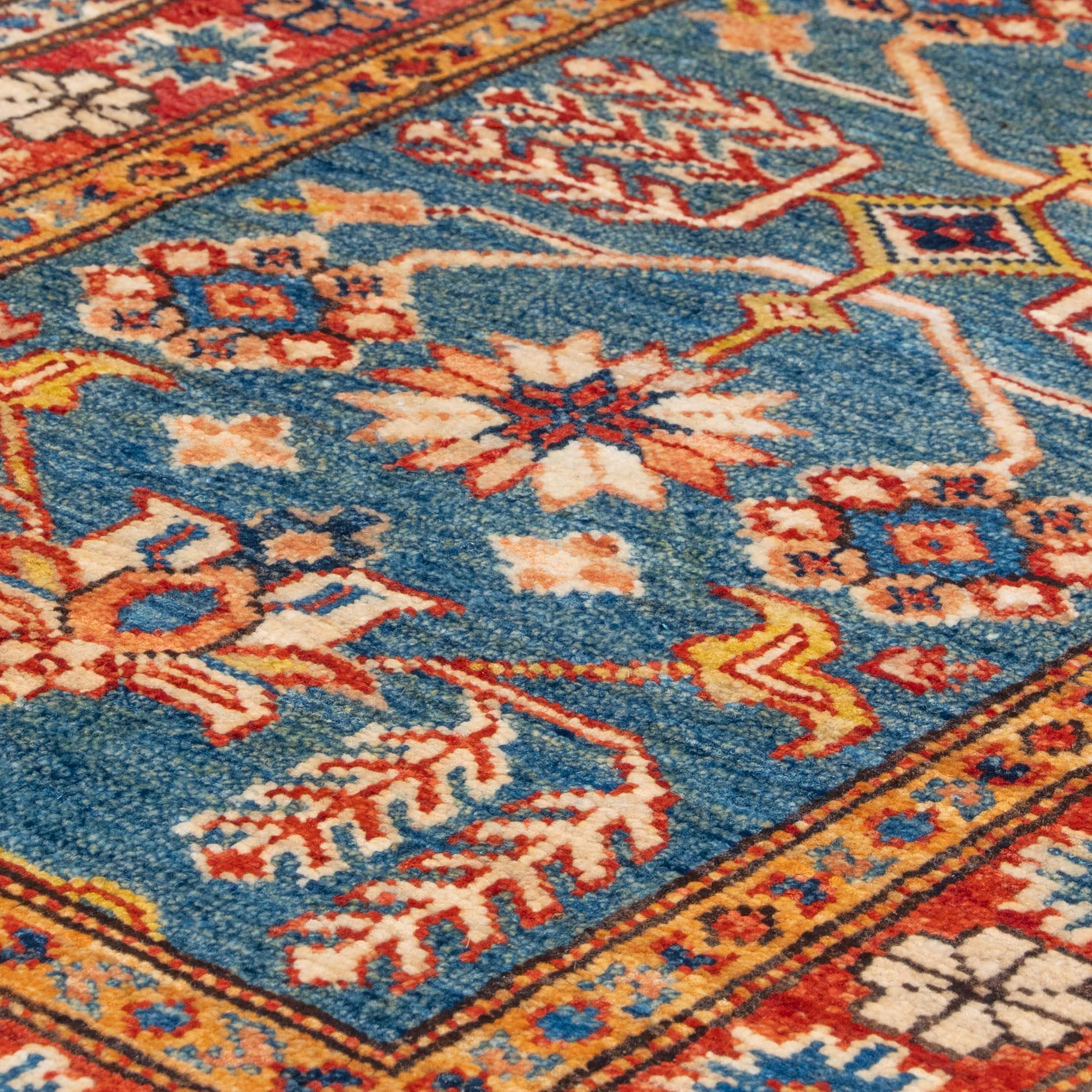 Although Kazaks are hand-knotted in Afghanistan, the design originates from the Caucasus. The short pile emphasises the sharpness of the pattern. Each piece is made using excellent Afghan wool, usually spun in Ghazni. Afghan wool is generally slightly coarser and curlier than other wools, making it perfect for carpet weaving. Afghan Kazak carpets are traditionally made with bold geometric designs in intense, vibrant colours such as rich reds, warm terracottas, and shades of blues with soft golds and creams.