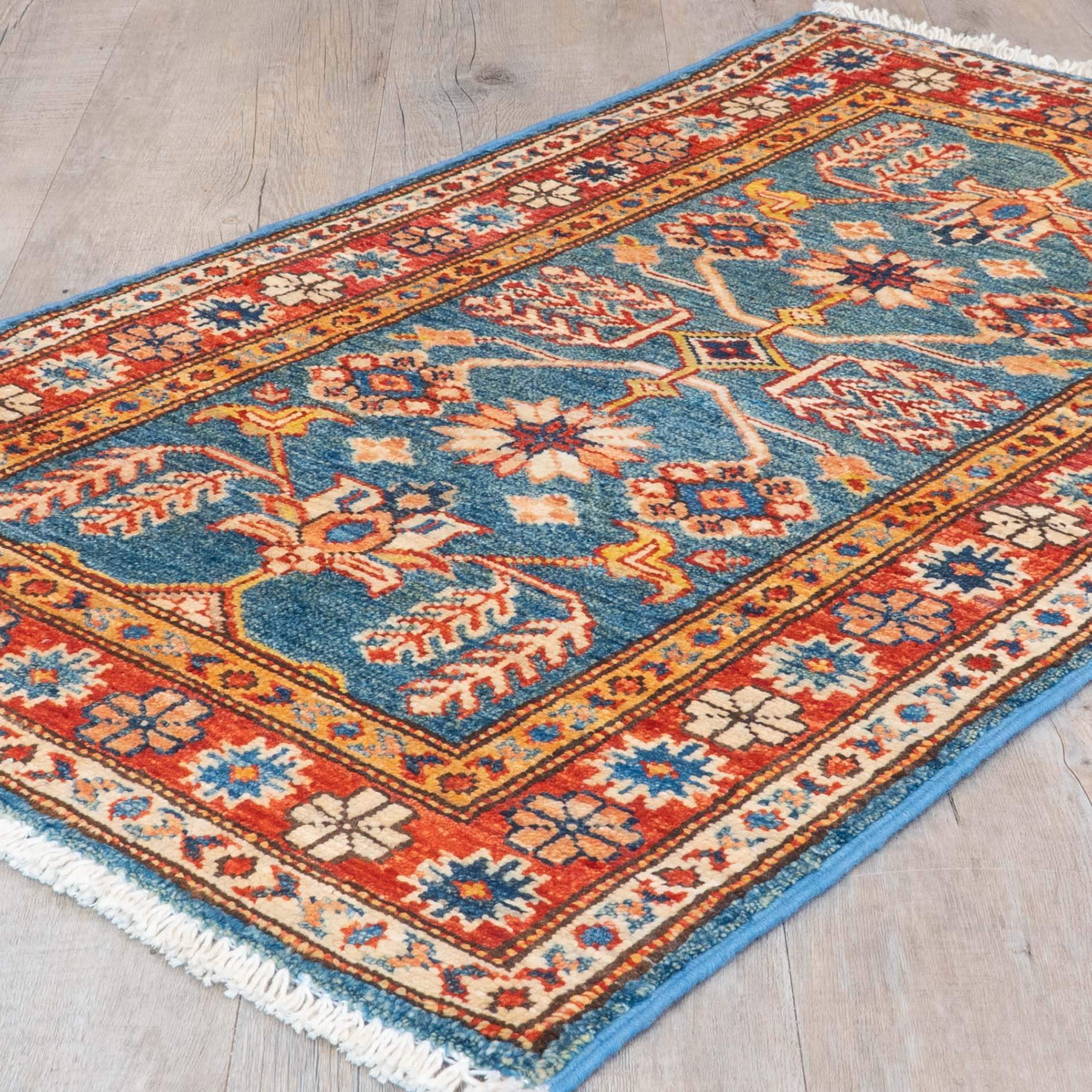 Practical and hardwearing, this is a quality piece built to last, combining authentic craftsmanship with timeless design. The colourful palette showcases a blue background complemented by rich red, gold, and cream. The short pile emphasises the sharpness of the pattern, revealing the wool's beautiful lustre. Please click the gold hyperlinks below for additional information. Although Kazaks are hand-knotted in Afghanistan, the design originates from the Caucasus. The short pile emphasises the sharpness of the pattern. Each piece is made using excellent Afghan wool, usually spun in Ghazni. Afghan wool is generally slightly coarser and curlier than other wools, making it perfect for carpet...