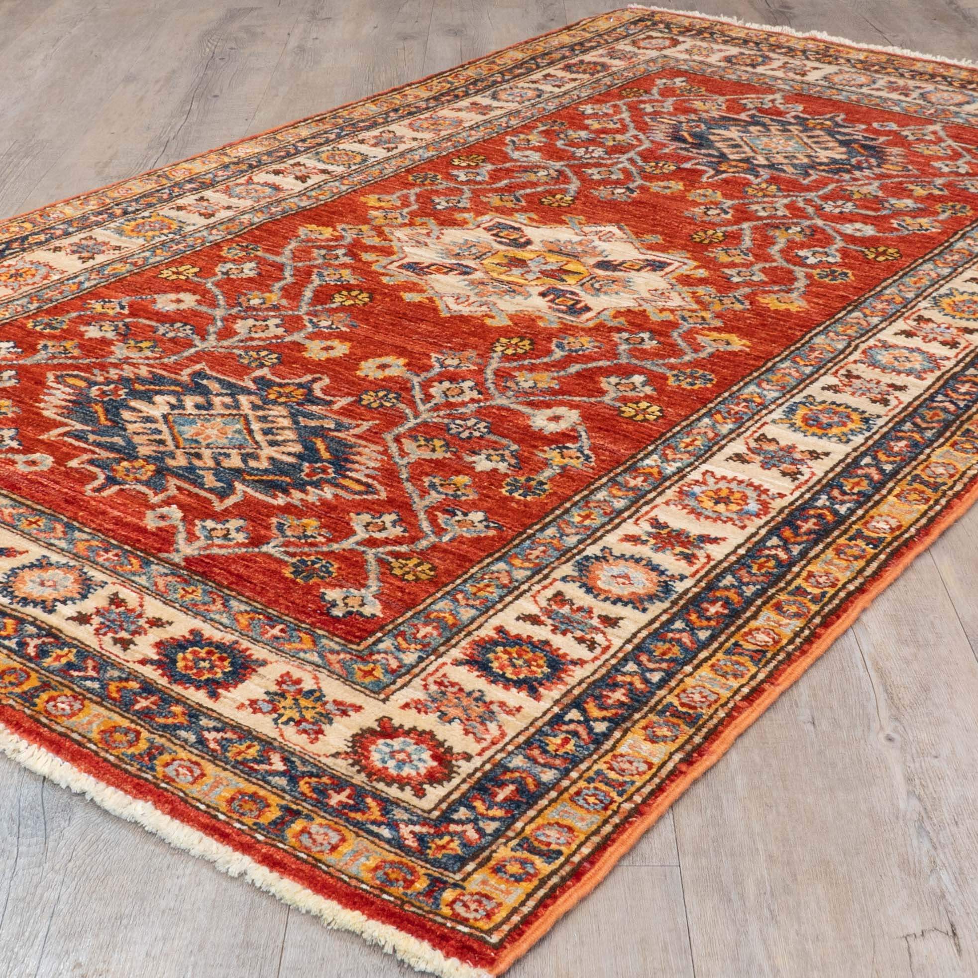 Handcrafted in the remote villages of northwest Afghanistan, this traditional Kazak rug represents generations of weaving mastery. Skilled artisans employ traditional techniques passed down through family lines, hand-spinning wool and colouring it with natural vegetable dyes. The striking design draws inspiration from classic Caucasian patterns, rendered in a vibrant palette of flame red, gold, cream and subtle blue tones. Built to withstand years of use, the fine-quality construction delivers both durability and a distinctive lustre throughout the pile. A statement piece that combines authentic craftsmanship with practical longevity.