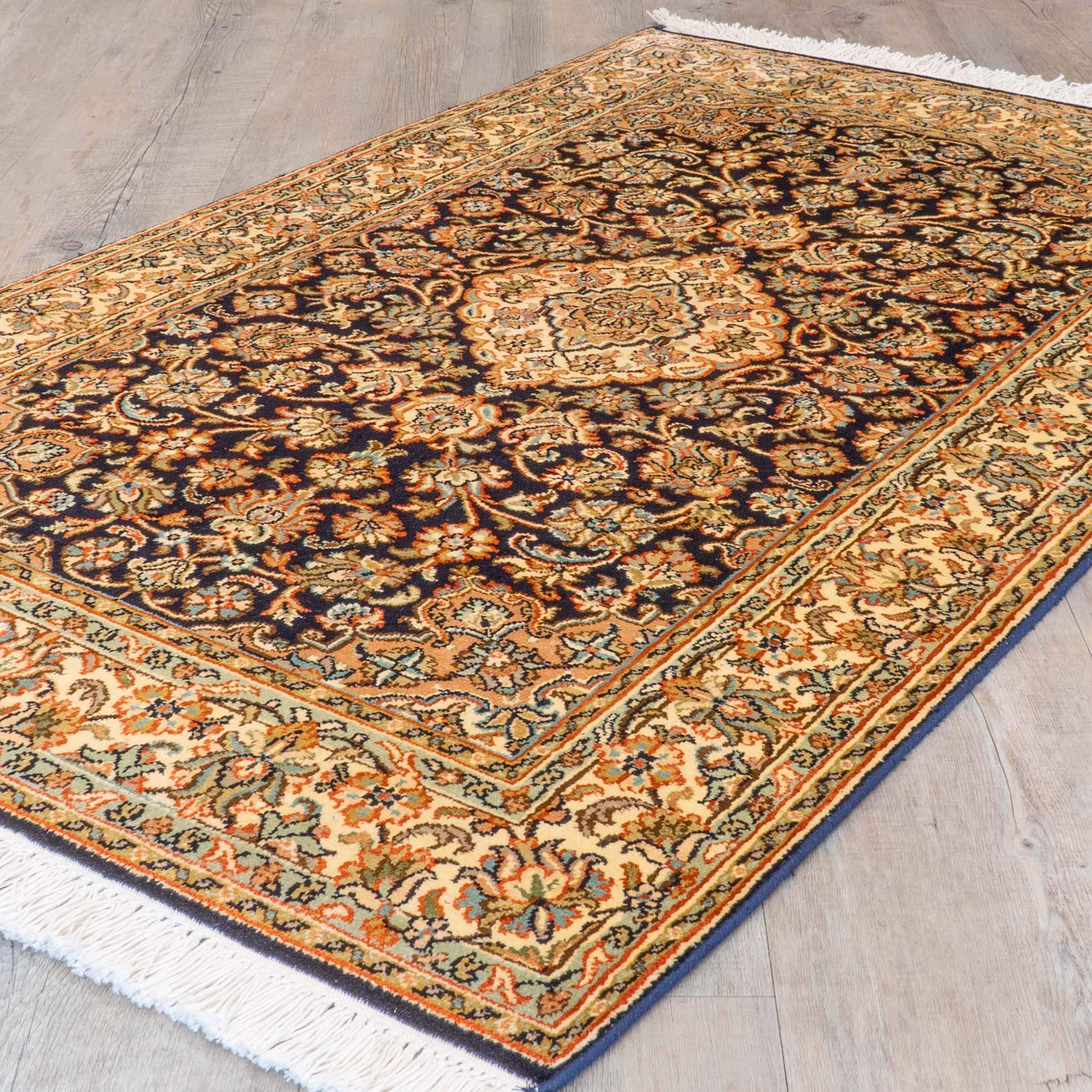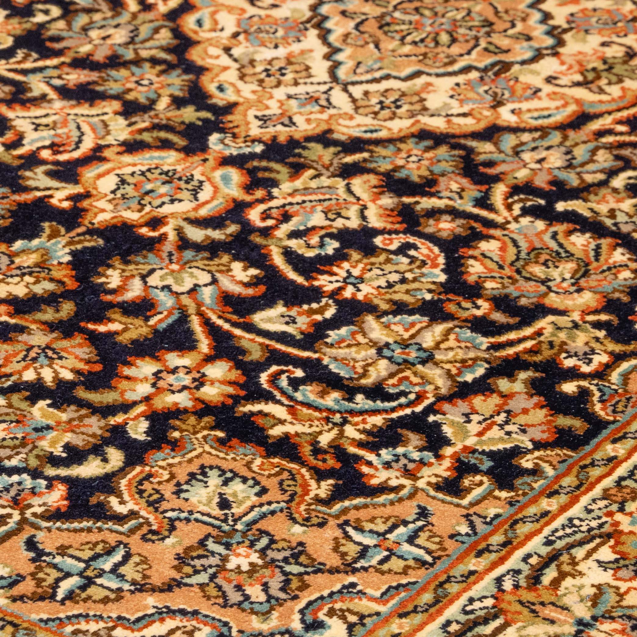 This beautiful, fine Kashmir silk rug features a central medallion in ivory, on a navy blue background with a cream border and touches of peach and duck egg blue. This is a classic, ornate Persian design often used in Kashmir silk rugs and carpets. Its compact size makes it ideal for a bedside rug or a wall-hanging.