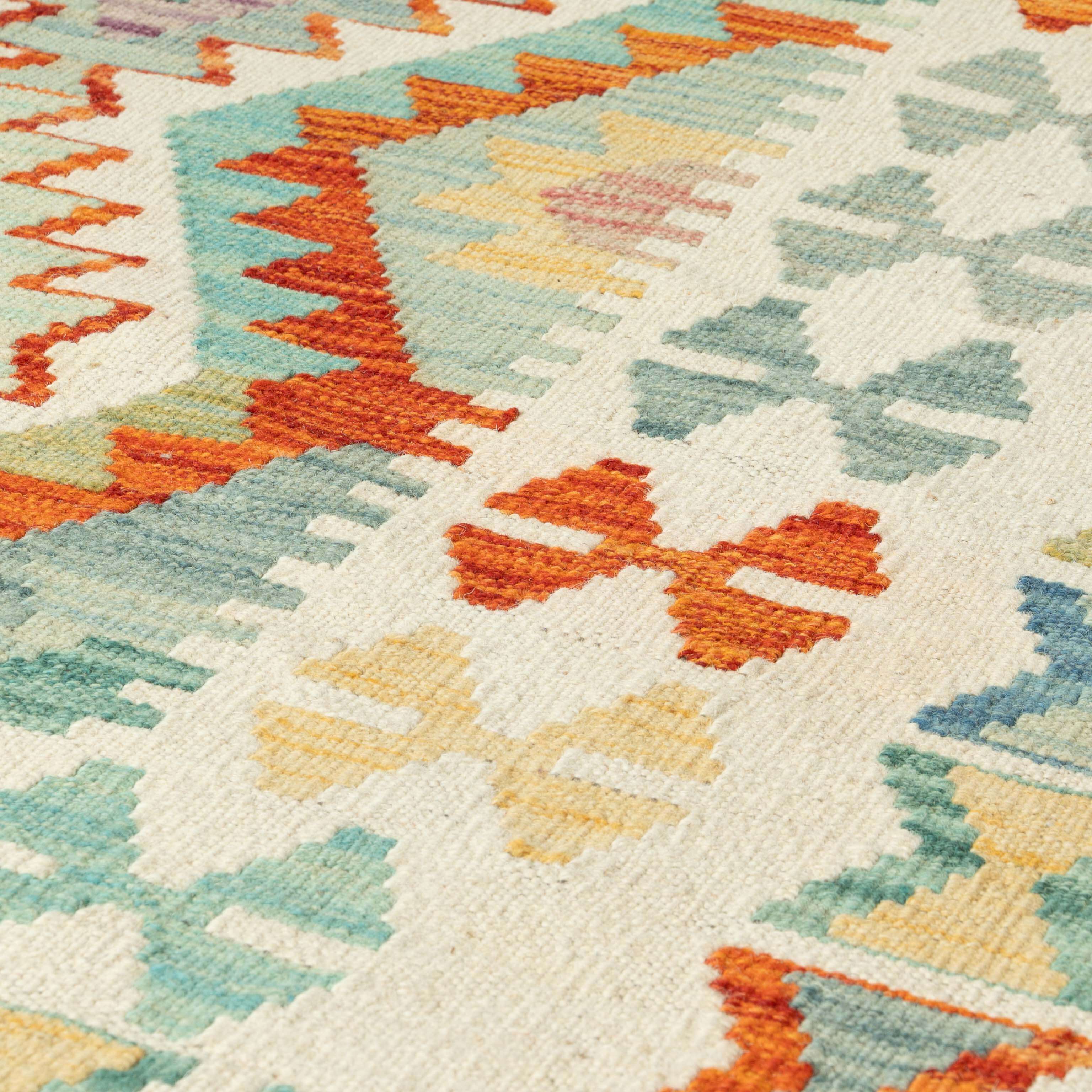Experience the quality and tradition of Afghan craftsmanship with our large handmade Kilim in soft colourings. This flat-weave kilim is woven from traditional, vegetable-dyed wool, making it durable and ideal for use with underfloor heating. Its colourful and striking design is reversible, allowing it to be used as a floor covering, wall hanging, or throw. Upgrade your space with this beautiful and inexpensive piece.
