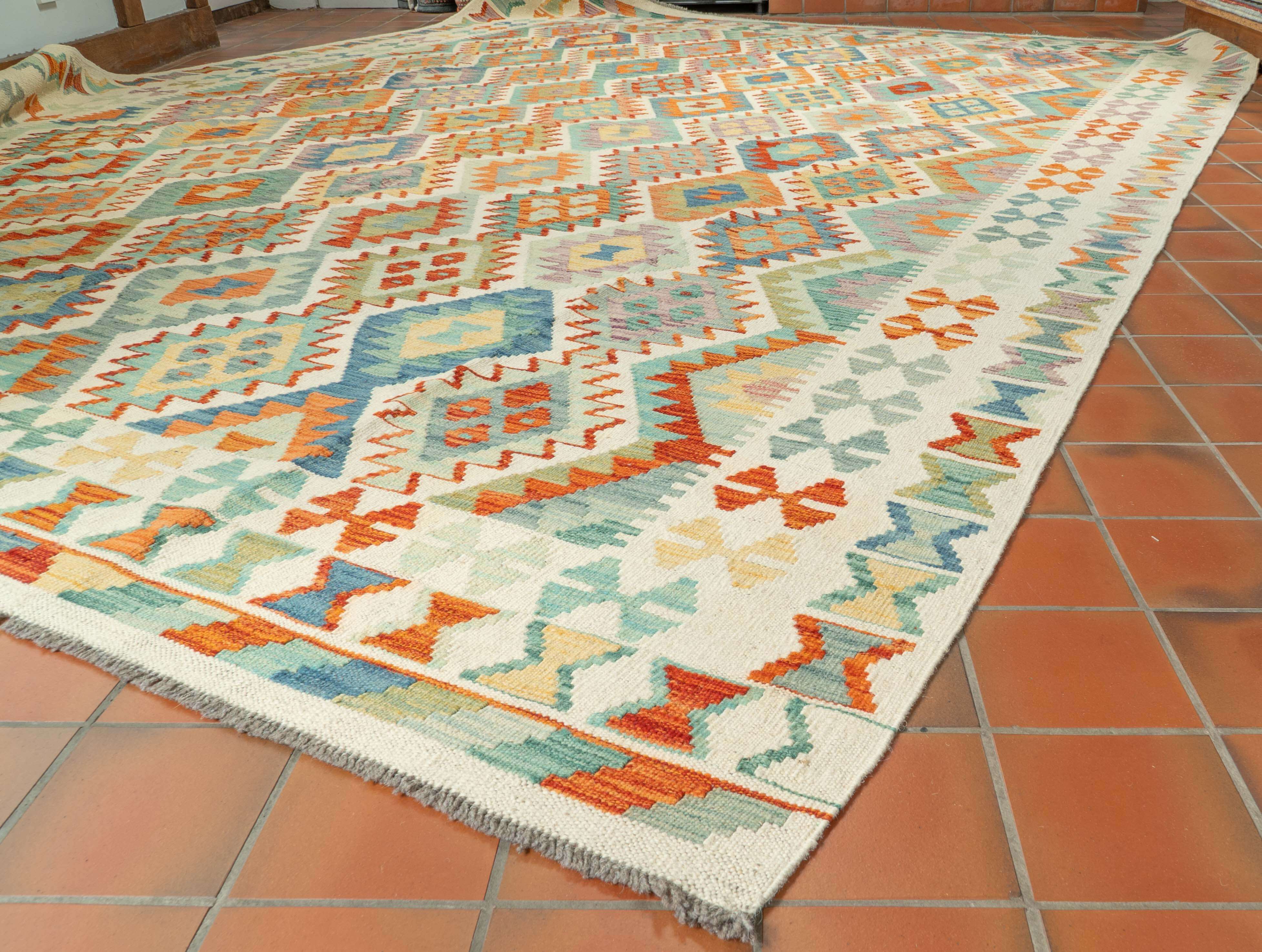 Experience the quality and tradition of Afghan craftsmanship with our large handmade Kilim in soft colourings. This flat-weave kilim is woven from traditional, vegetable-dyed wool, making it durable and ideal for use with underfloor heating. Its colourful and striking design is reversible, allowing it to be used as a floor covering, wall hanging, or throw. Upgrade your space with this beautiful and inexpensive piece. Please click the hyperlinks in gold if you are interested in additional information. Kilim rugs are serviceable and practical, giving the owner the advantage of being made from one of the most beautiful natural yarns, "wool",...
