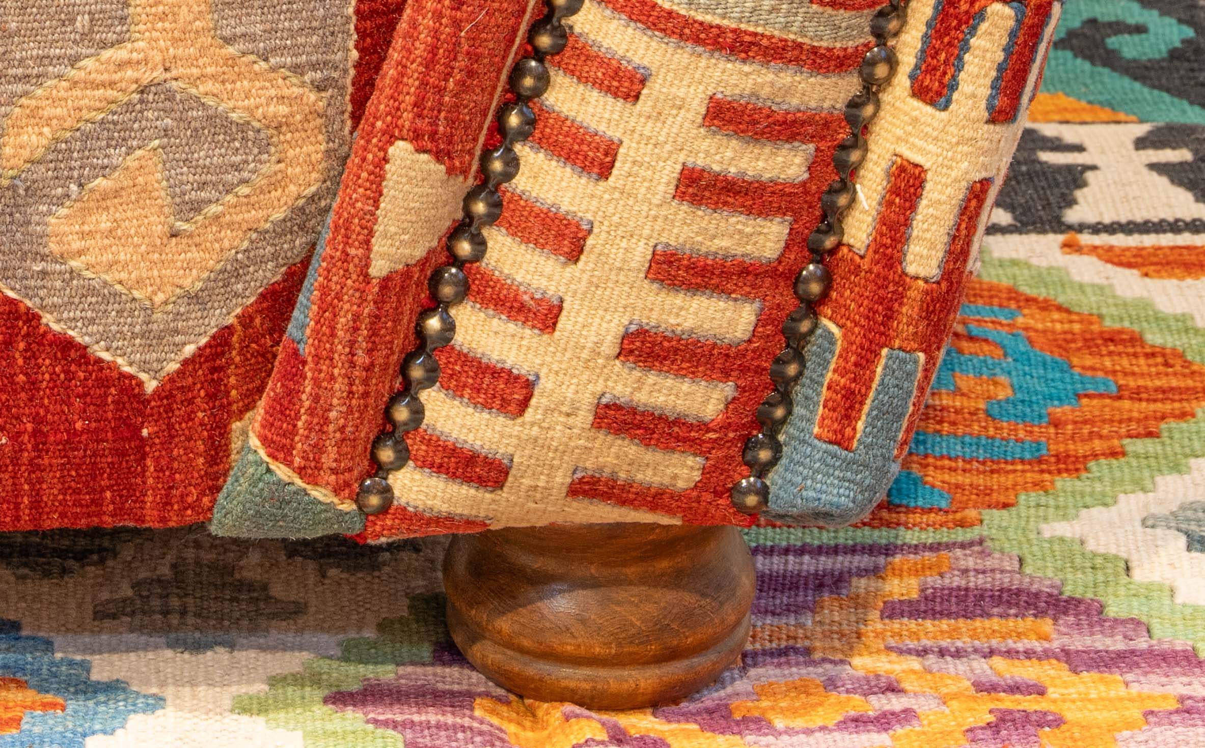 Before the Kilim is fitted to the furniture, it is bonded to a secondary fabric to prevent the open areas from exposing the fillings and to make it more secure.
