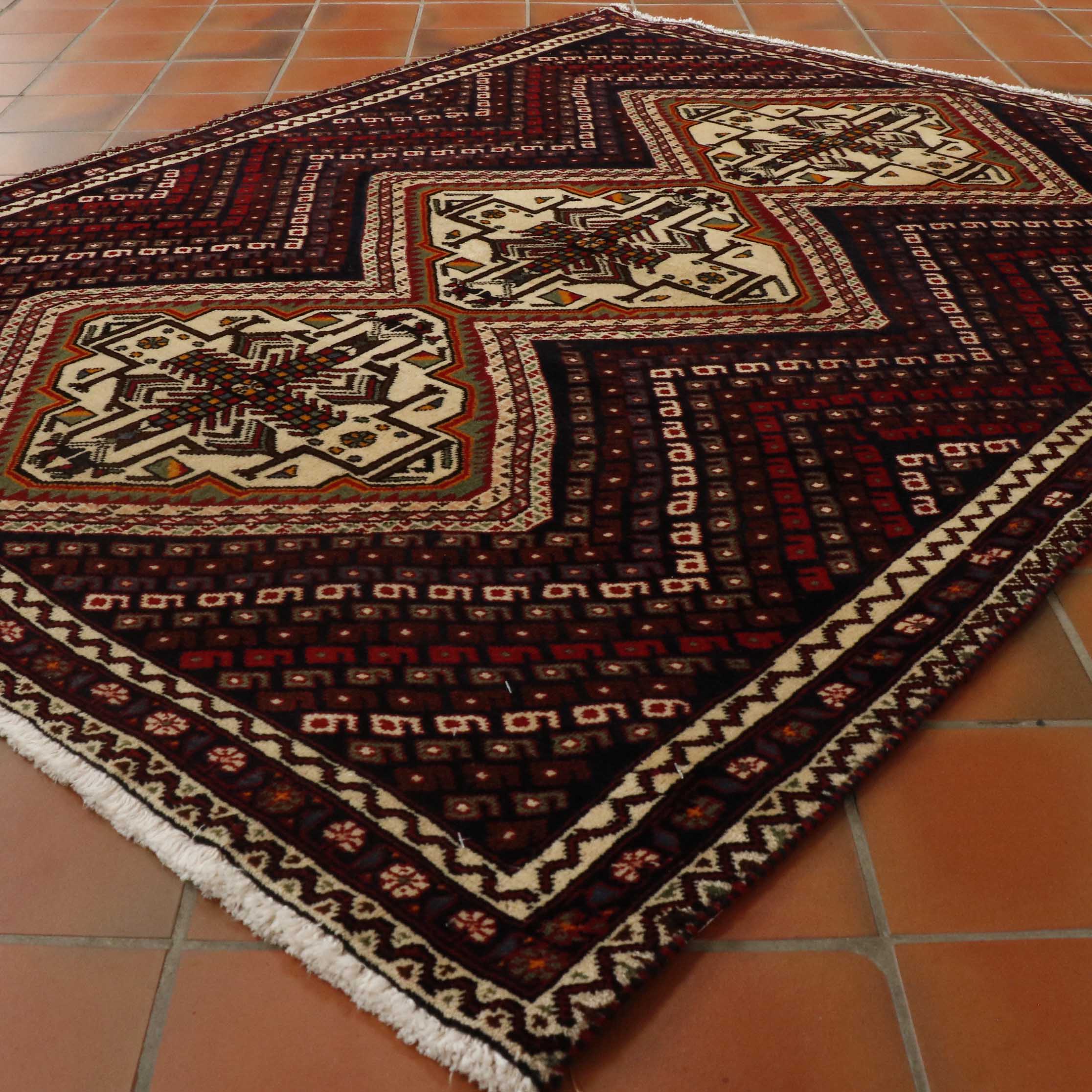 This authentic Shahrbabak rug showcases three striking central medallions rendered in the traditional Persian regional style. Hand-knotted from soft wool on cotton wefts, the design features intricate geometric patterning throughout, with a sophisticated palette of deep browns, warm reds, and cream tones that develop character with age. Each medallion displays the hallmark complexity of this weaving tradition, making this piece a distinguished addition to any interior with genuine cultural heritage and artisanal craftsmanship.