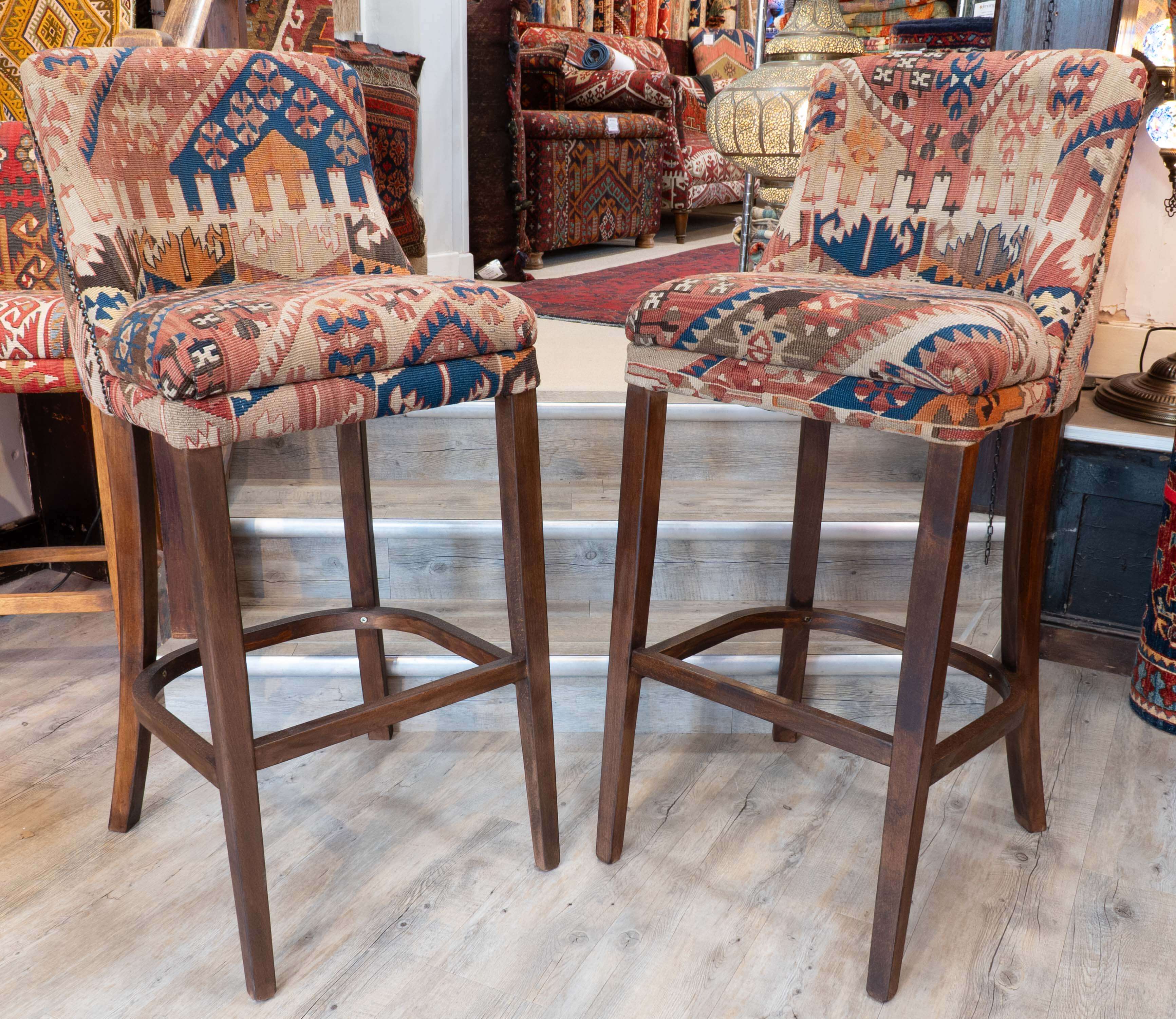 These interesting barstools are very smart. The salvaged Kilim has been repurposed into high stools, which will be a fabulous addition for anyone seeking something extra special and unique. Each piece of Kilim has been expertly placed to full effect; although we can't do multiple identical chairs, we try to get them made as 'Jack & Jill' pairs. Of course, if anyone requires more, we can cut kilims from the same piece to create a set more like a 'harlequin set'. Don't hesitate to contact us to discuss this if needed. Finally, the chairs were studded around the back, and the wood was polished with Danish wax to a medium oak.
