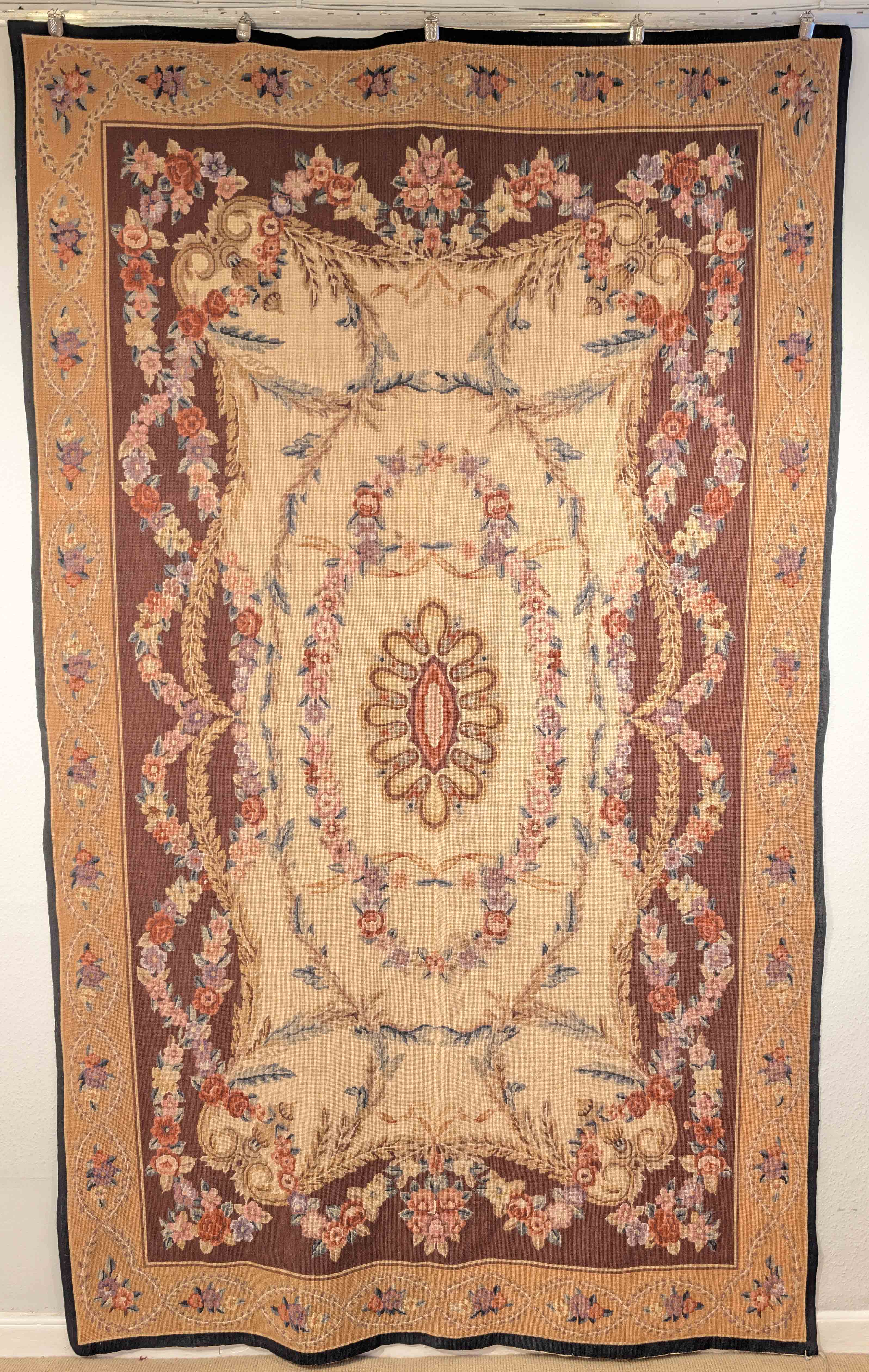 This needlepoint rug is the only piece we have. It has not been listed on our website before because it is unique. Sometimes Clare falls for something unusual, and this is one of them. It may suit an older-style property with beams, where it could be wall-hung. The needlework creates a beautiful, textured image in rich autumnal colours. It is handmade with wool stitched onto a cotton foundation. It is used as a floor rug. I recommend an antislip underlay. We recommend the use of an underlay with this product:www.jenningsrugs.co.uk/collections/Foxi-underlay Product Size: 244 x 152cm  (8'0 x 5'0)