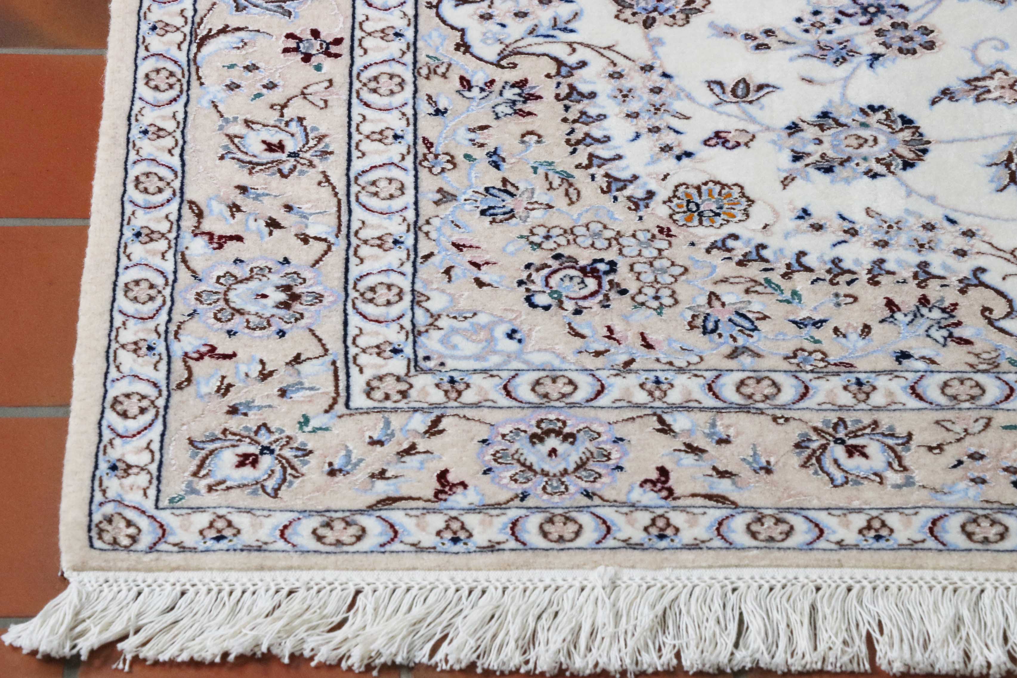Crafted with skill and finesse, this exquisite handmade Persian Nain rug brings traditional elegance to any room with its classic style. It features an ornate central medallion and intricate details in muted blues, ivory, and ruby red, all expertly woven into a wool pile on a cotton foundation. Transcending time and trends, this timeless rug is a luxurious addition to any home.
