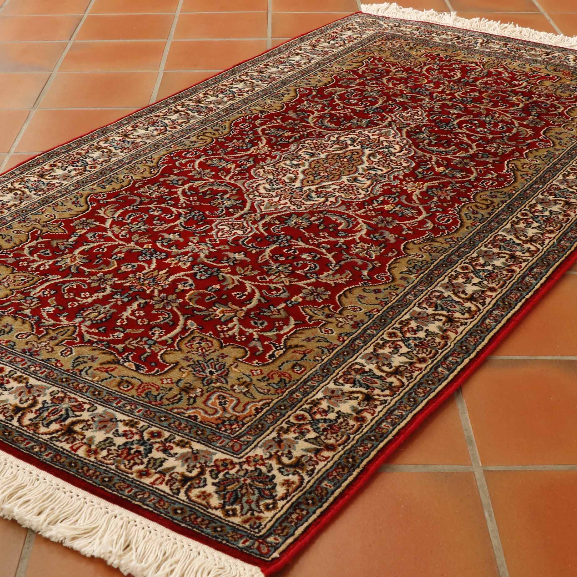 The size of this piece is slightly different from most. Generally, for a 4ft length, the width will be 2'8. However, this piece is only 2ft wide. They have used a brilliant bright red for the background shade and cream for the main border with an inner wall of gold. The shape of the rug gives the medallion more of an elongated shape.