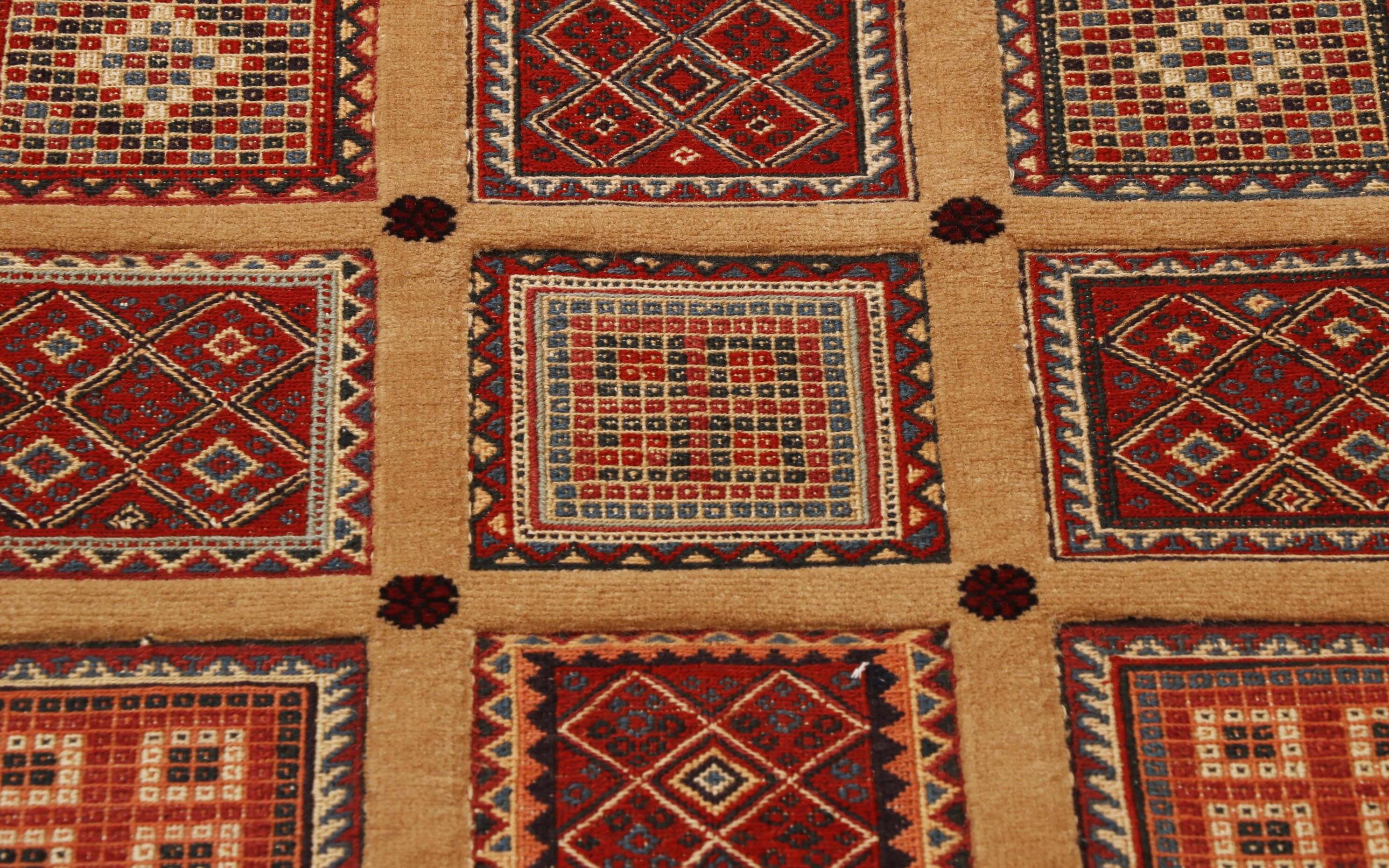 This Persian Sirjan kilim is a fascinating piece, as it is made with part Sumak weave (embroidered kilim) and part carpet pile, giving it an embossed look. It is made from 100% wool on a cotton foundation. The Sirjan rug would also make a lovely wall hanging. At Jennings Rugs, we are constantly on the lookout for rugs and carpets that are more unusual, and this piece is indeed very unique.