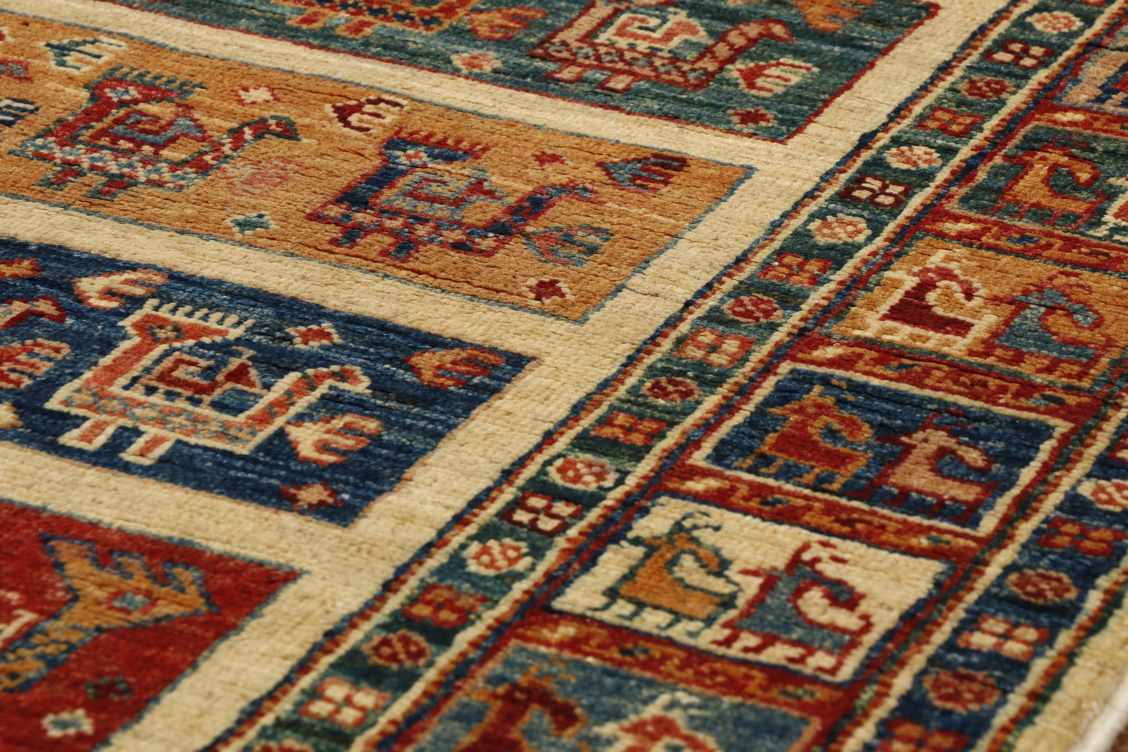 This is a striking runner for all animal and bird enthusiasts. This piece is an absolute joy to behold, with many quirky, stylised goats and peacocks with their fantails. They have used a broad mix of colours from brick red and bottle green to old gold and dark blue, with some terracotta and cream thrown in for good measure.