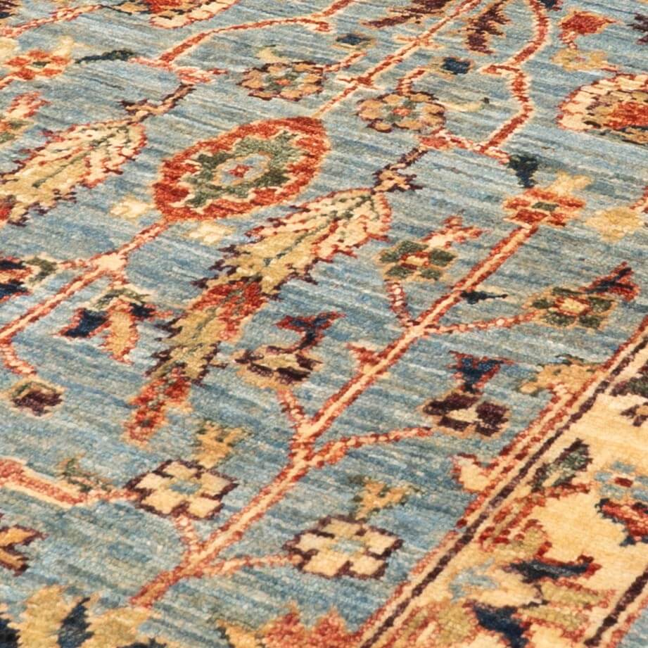 This unique and varied collection is produced in northwest Afghanistan and has a construction similar to that of the Ziegler rugs. The wool is hand-sheared from the indigenous Karukal sheep. It is then hand-spun and coloured using natural vegetable and mineral dyes. These pieces have utilised attractive old Persian designs and patterns from unusual museum pieces. They are generally more vibrant colours and less muted shades. However, the exciting and uplifting colours remain almost Jewel-like. The final finishing processes are carried out in Pakistan, where some post-production takes place; this includes alignment corrections, surface clipping and tumbling, and the washing mentioned earlier.