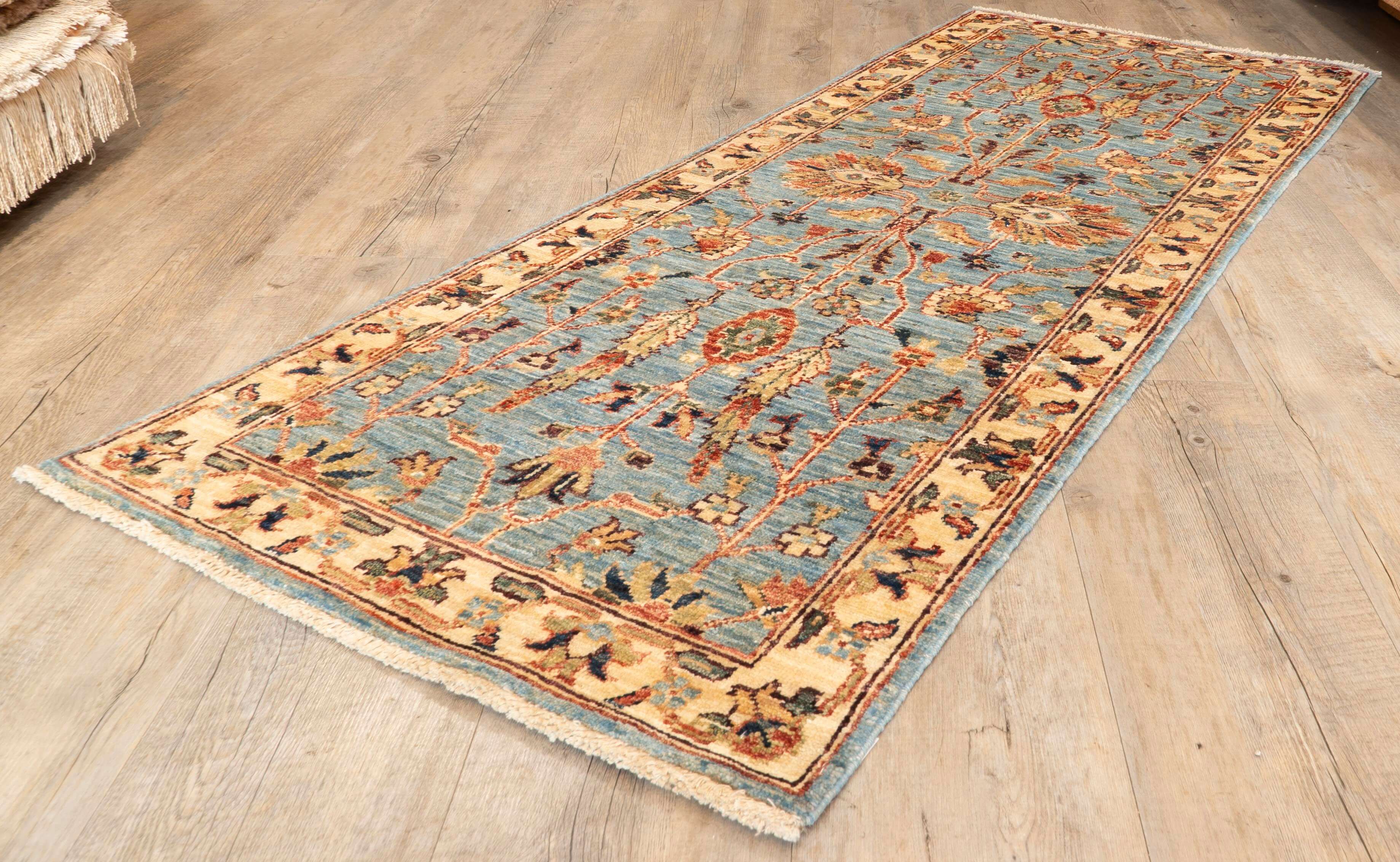 Enhance your living space with this distinctive handmade Afghan Choeb Rang runner rug, featuring a traditional design that adds character and charm. The harmonious blend of gold and blue offers subtlety and vibrancy, while the durable wool construction ensures lasting quality. Elevate your décor with a piece that combines artistic uniqueness and enduring craftsmanship, moving beyond the ordinary to bring a sophisticated touch to your home.