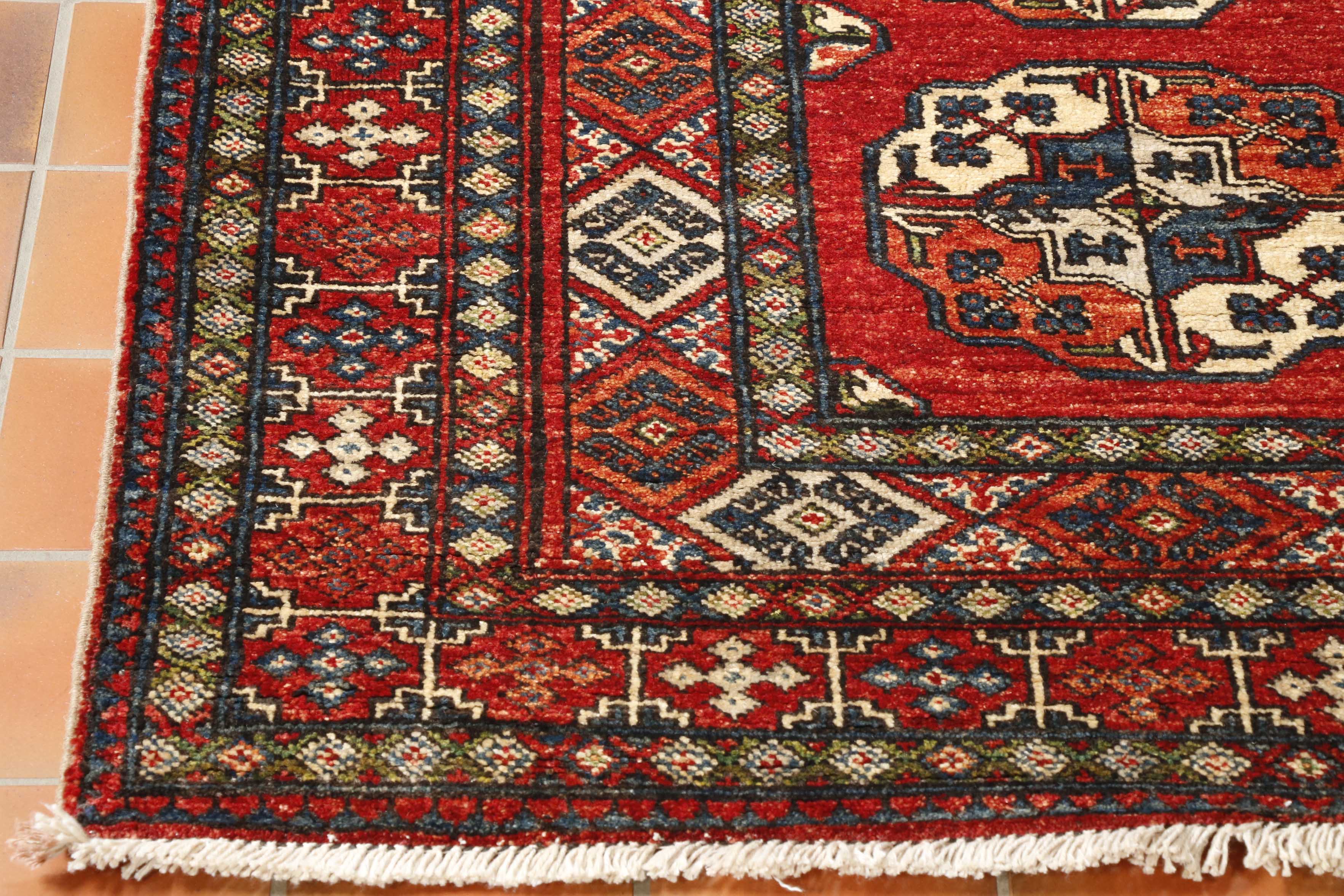 Ersari rugs are hand-knotted using methods passed down from the Turkmen people of Central Asia. The vibrant colours come from vegetable dyes, such as the rich reds produced from boiling the root of the madder plant. These rugs often feature traditional "Gul" (also known as elephant 's-foot) designs.