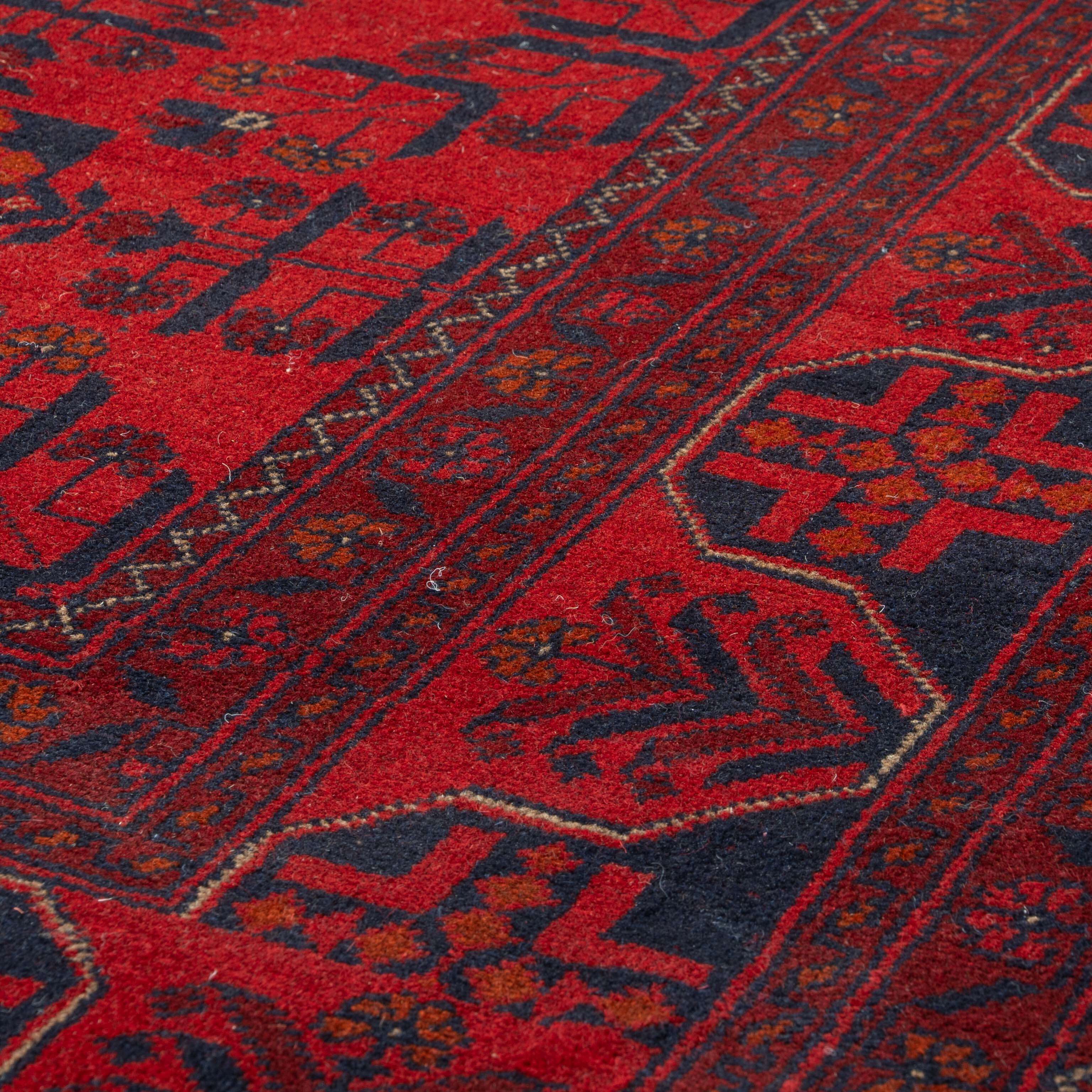Treat yourself to a unique work of art with this gorgeous, handmade Afghan Khal Mohammadi rug. Its traditional design features a classic red background with a stunning dark blue design crafted from pure wool on cotton and coloured with natural vegetable dyes. This authentic piece adds a touch of history and craft to your home.