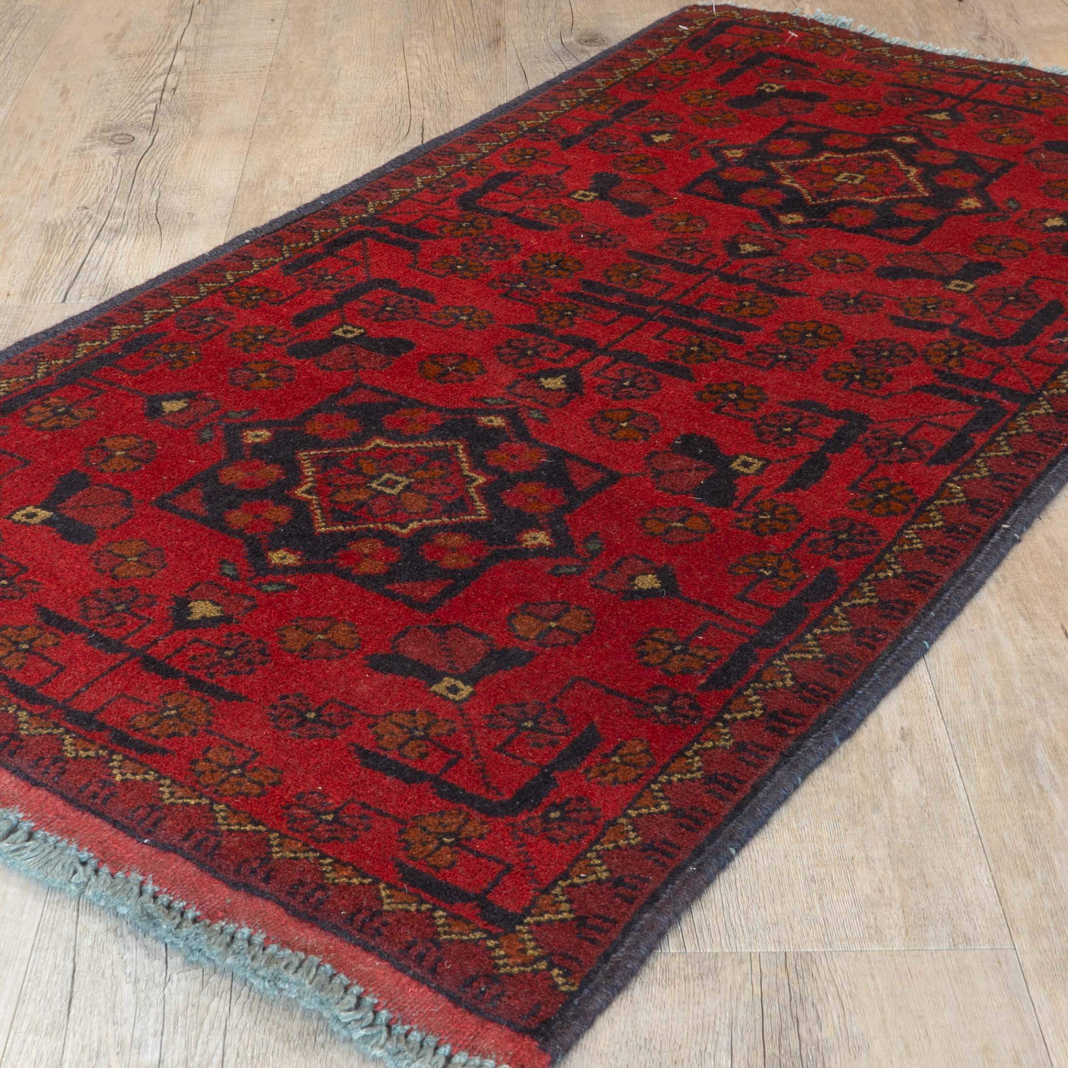 The rich red of these rugs is created from boiling the madder plant's root, which grows wild in that part of the world. They are finely knotted from wool of the Karakul sheep, which graze the mountainous terrain. The colour and design make them very practical. Some recurring motifs are guls (elephant-foot patterns and octagonal, often curvilinear flowers in dark blue, ochre, and beige. We have an extensive collection of handmade Afghan Khal Mohammadi rugs and carpets in various sizes, available online and in-store. Why not come to Tewkesbury and find a beautiful carpet that suits your needs?
