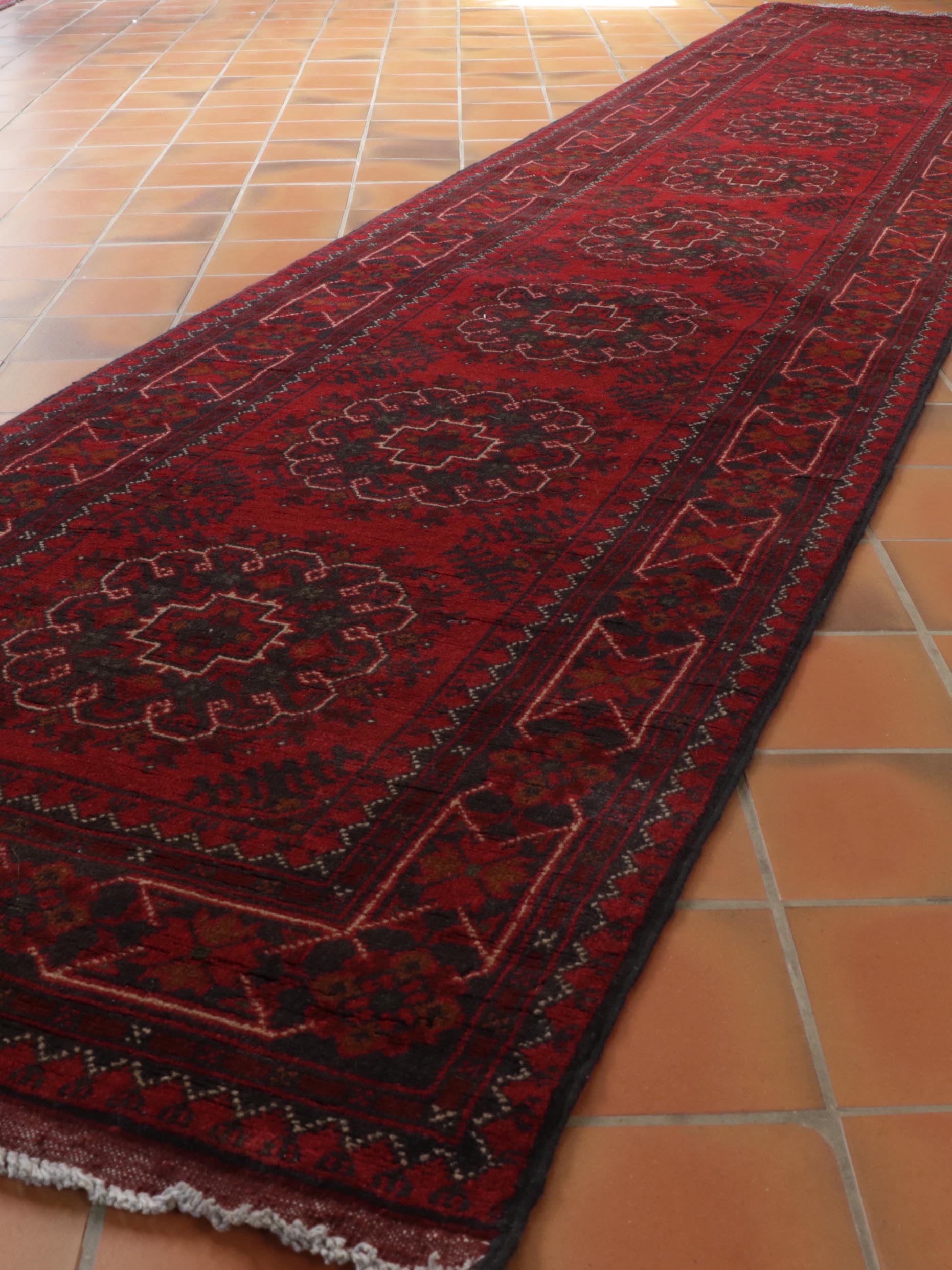 This handmade Afghan Khan Mohammadi long runner is a beautiful traditional handwoven rug meticulously crafted using premium vegetable-dyed hand-spun wool. It was carefully handmade by skilled artisans from Northwest Afghanistan. It is designed for its practical and hardwearing qualities and offers fantastic value for money. Its extra-long length adds beauty and elegance to any room.