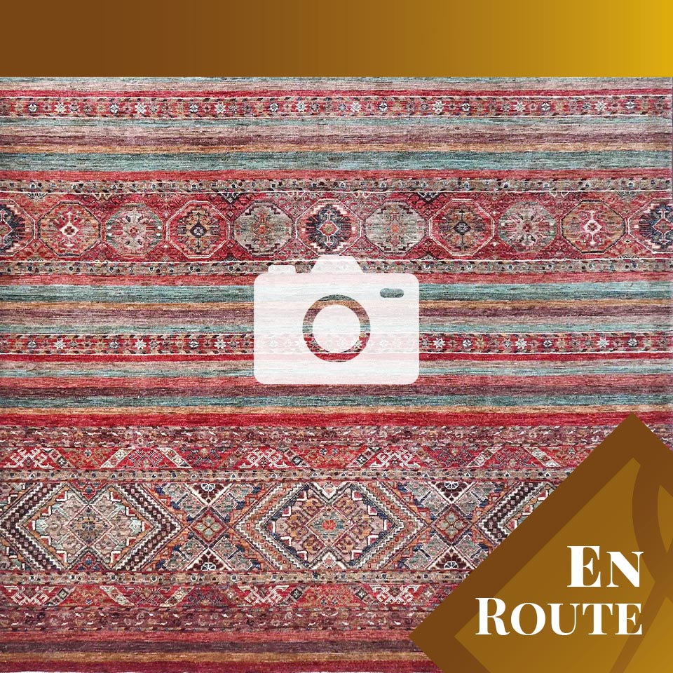 Kharjeen (Khorjin) rugs, runners and carpets are still hand-knotted, and the wool is coloured with vegetable dye. The Kharjeen (also known as Khurjeen) rug designs can be reminiscent of Gabbeh designs. The colours of the Kharjeen rugs and carpets are similar in many ways to those used in our Samarkand and Loribaft collections. Some Kharjeen pieces do not have fringes and are finished with a plain kilim end or binding secured to prevent fraying. The other rugs are generally produced like the Samarkand carpets with an unusual bobbin wind on the warps.