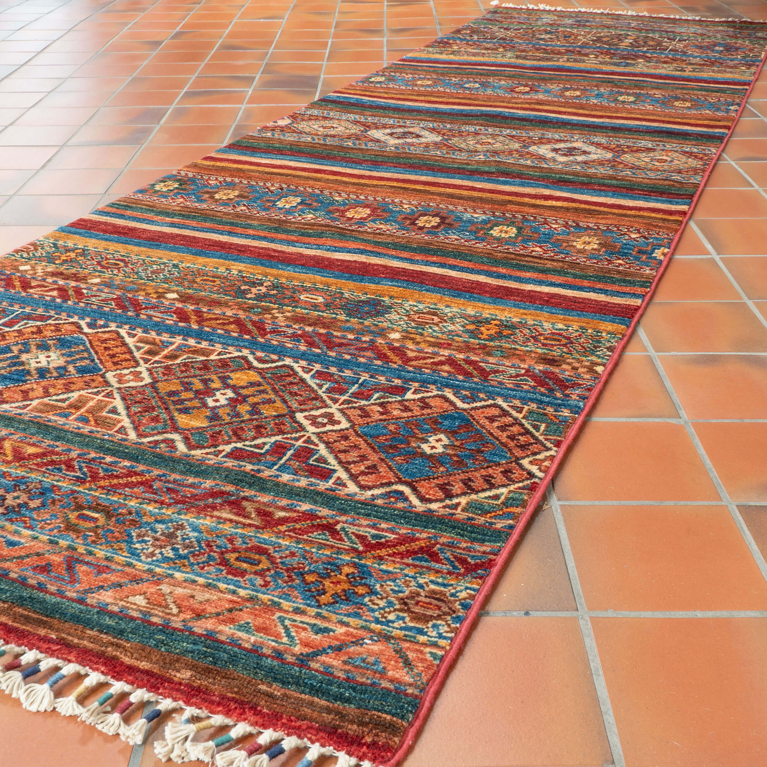 Say hello to instant happiness with this delightful handmade Afghan Kharjeen runner! Packed with eye-catching multicoloured stripes that practically sing with joy, it's a masterpiece of traditional craftsmanship. The playful bobbin fringes bounce along the edges like confetti, while the sturdy construction ensures it'll brighten your space for years to come. Each runner is uniquely handwoven, making it a one-of-a-kind companion for your home. Perfect for adding a cheerful pop of colour and authentic character to any room that deserves a little extra impact.