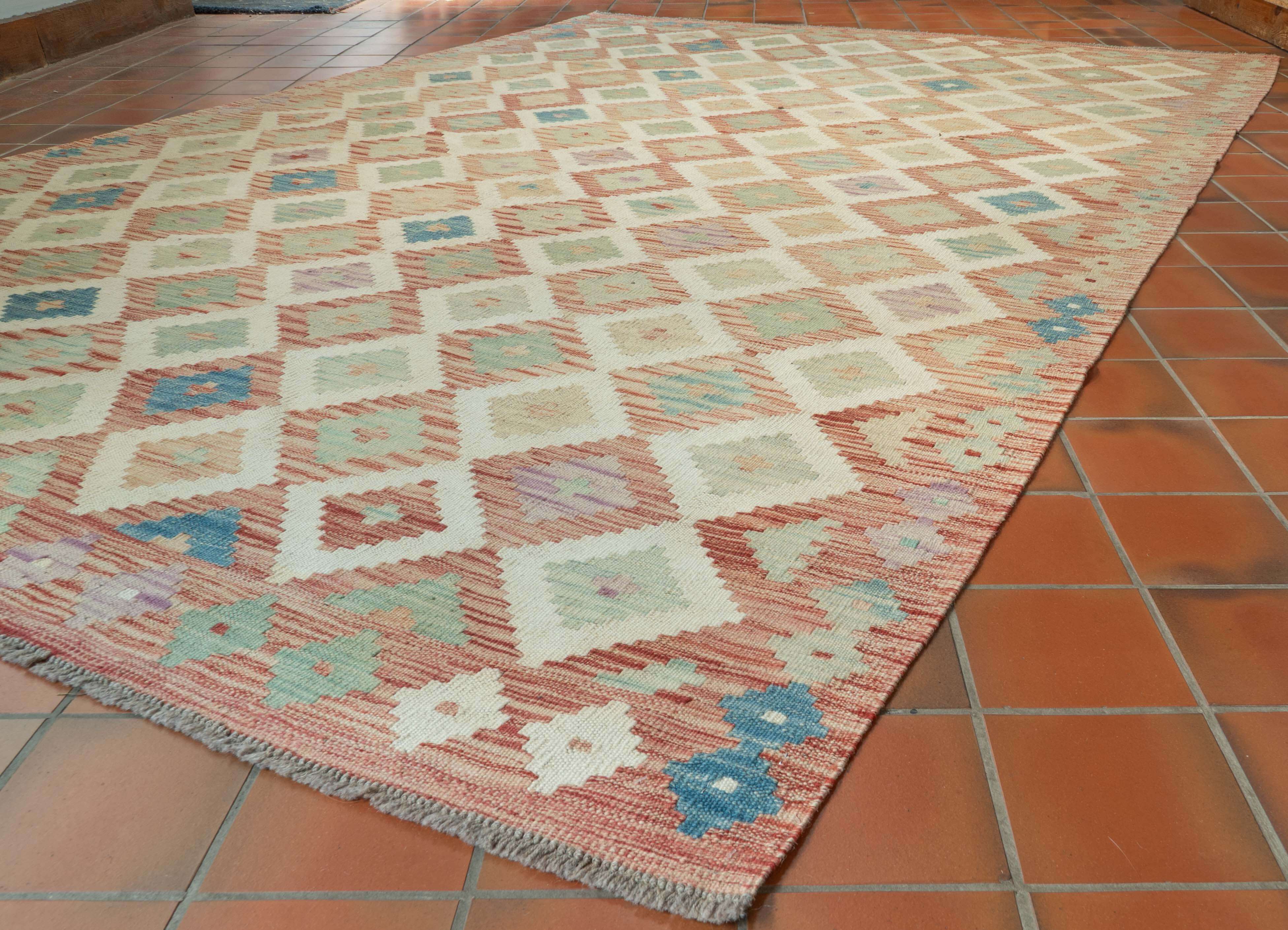 Experience the quality and tradition of Afghan craftsmanship with our handmade Kilim. This flat-weave kilim is woven from traditional, vegetable-dyed wool, making it durable and ideal for use with underfloor heating. Its colourful and striking design is reversible, allowing it to be used as a floor covering, wall hanging, or throw. Elevate your space with this stunning and affordable piece.