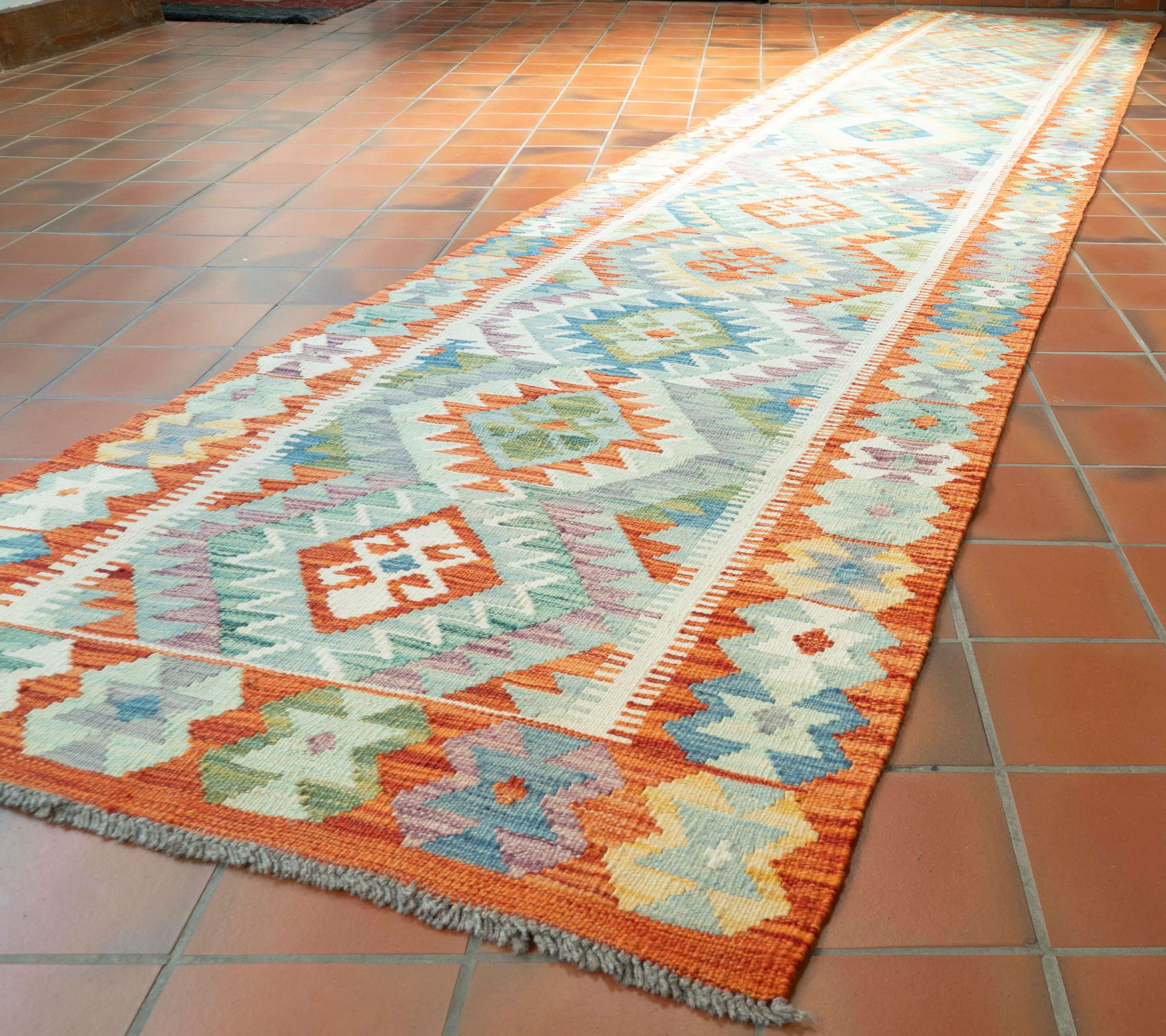 Experience the quality and tradition of Afghan craftsmanship with our extra-long handmade Kilim runner. This flat-weave kilim is woven from traditional, vegetable-dyed wool, making it durable and ideal for use with underfloor heating. Its colourful and striking design is reversible, allowing it to be used as a floor covering, wall hanging, or throw. Upgrade your space with this beautiful and inexpensive piece.