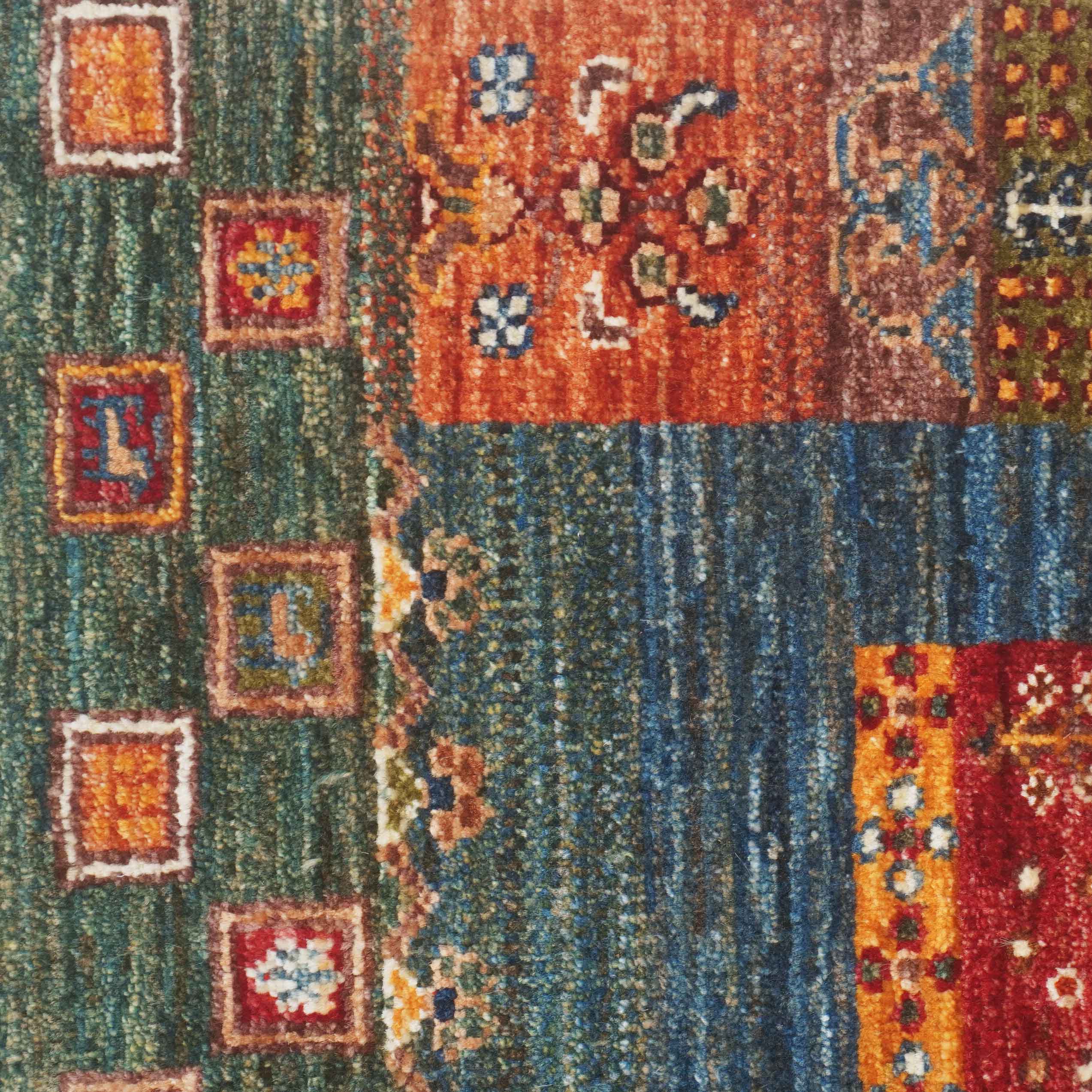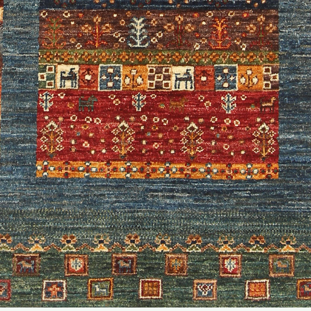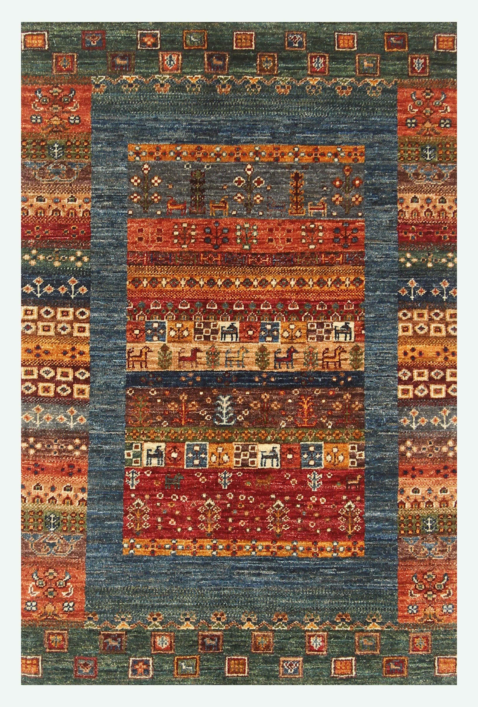 The carpets are still hand-knottedand the wool is coloured with vegetable dye. The Loribaft rug designs can be reminiscent of Gabbeh designs, although the Loribaft pieces are more refined and tightly knotted. The colours of the Loribaft rugs and carpets are similar to those used in our Samarkand collections and possibly more vibrant. The main distinction is that the patterns are playful, using a defined colour palette and simple design, with stylised animals, plants, trees or characters with block colour often mimicking an ombre effect. Some Loribaft pieces do not have fringes, so they are finished with a plain kilim end or binding and secured to prevent fraying. Like the Samarkand carpets, other rugs are produced with an unusual bobbin wind on the warps.