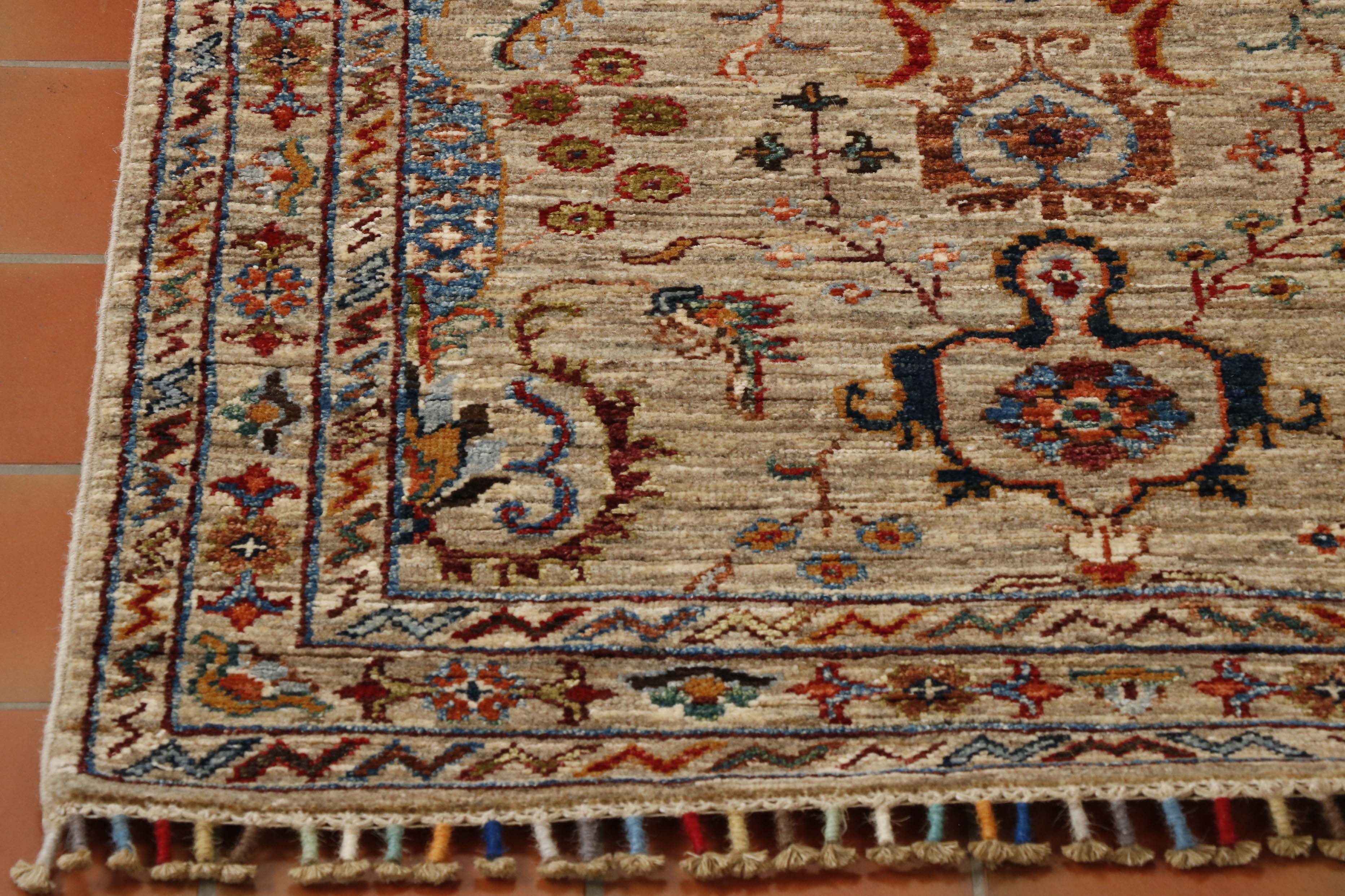 These beautiful pieces are new, appearing on the market around 2017. These wool rugs and carpets feature a distinctive Caucasian design, similar to that of Kazak pieces. However, that is where the similarity ends. The rugs mostly have brightly coloured bobbin-wound fringes and no borders. Instead, the old Caucasian design is mixed into bands or stripes of bright colours. Our Afghan Samarkand rugs are handmade using naturally dyed wool on a cotton foundation. The wool used is taken from the native Karakul sheep. It is very tough and has a high natural oil content.