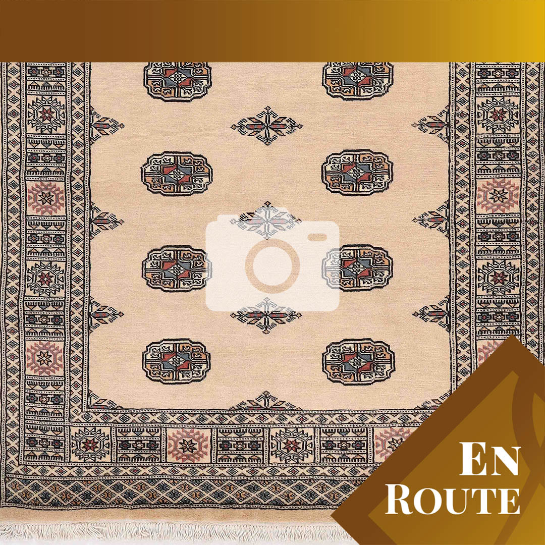 The well-known Bokhara design originates from Uzbekistan, where the nomadic Turkoman tribespeople first took their rugs to be sold. The repetitive octagonal motif, known as a "gul" (Persian for "rose"), is a characteristic feature of Bokhara rugs. Today, Pakistani people weave this design in a wide range of colours and sizes.