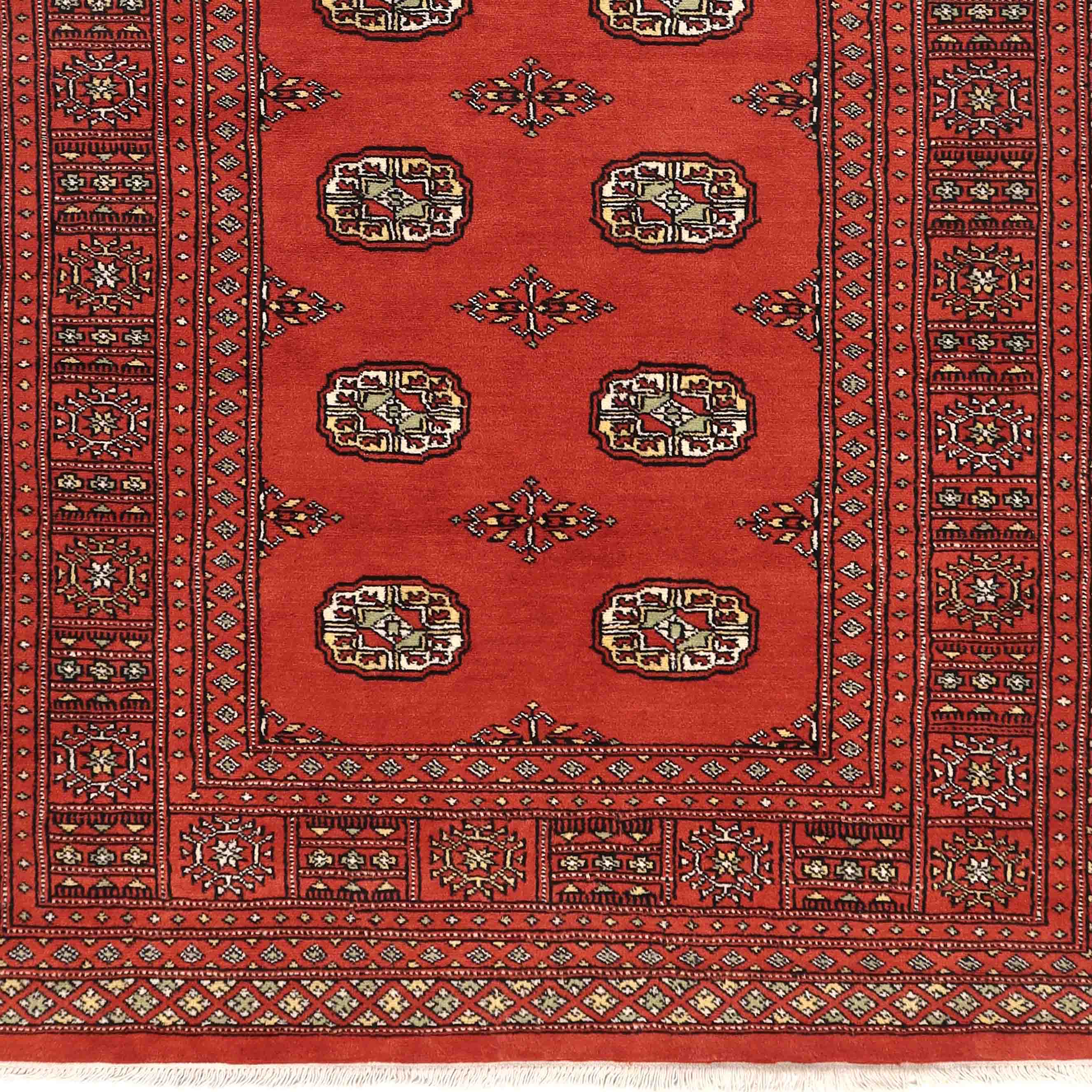 The well-known Bokhara design originates from Uzbekistan, where the nomadic Turkoman tribespeople first took their rugs to be sold. The repetitive octagonal motif, known as a "gul" (Persian for "rose"), is a characteristic feature of Bokhara rugs. Today, Pakistani people weave this design in a wide range of colours and sizes.