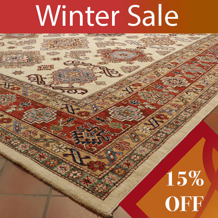 Although Kazaks are hand-knotted in Afghanistan, the design originates from the Caucasus. The short pile emphasises the pattern's sharpness. Each piece is made using excellent Afghan wool, usually spun in Ghazni. The Afghan wool is generally slightly coarser and more curly than other wools and is perfect for carpet weaving. Afghan Kazak carpets are traditionally made with bold geometric designs in intense, vibrant colours such as rich reds, warm terracottas, and shades of blues with soft golds and creams.