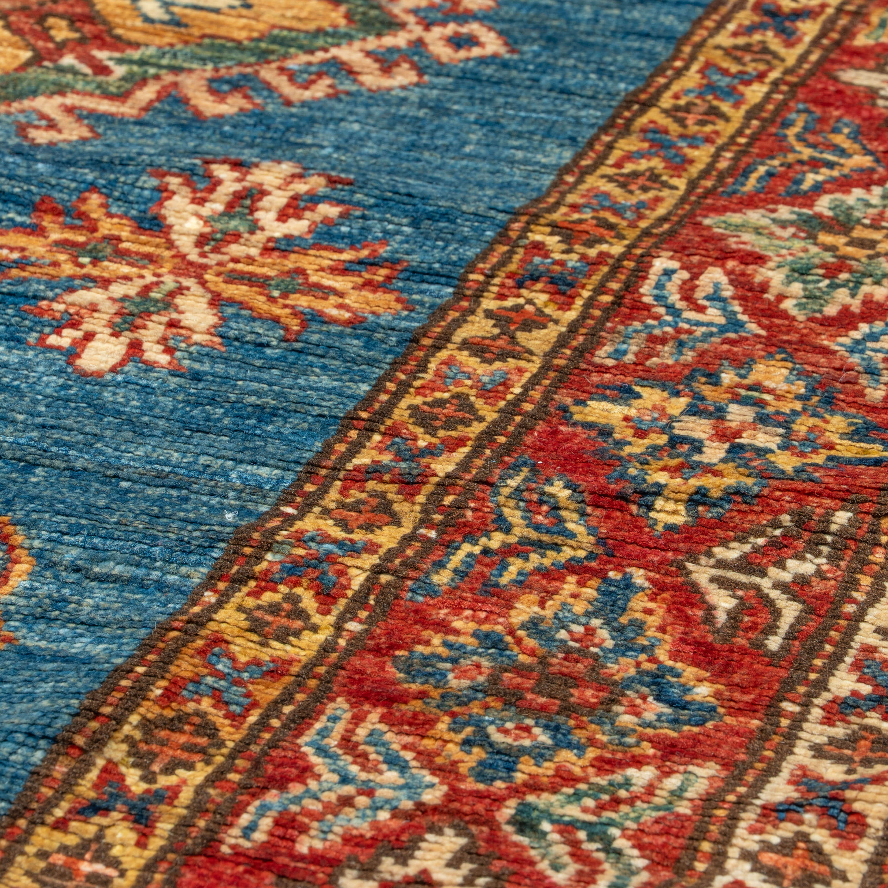 Although Kazaks are hand-knotted in Afghanistan, the design originates from the Caucasus. The short pile emphasises the pattern's sharpness. Each piece is crafted from exceptional Afghan wool, typically spun in the Ghazni region. Afghan wool is generally slightly coarser and curlier than other wools, making it perfect for carpet weaving. Afghan Kazak carpets are traditionally made with bold geometric designs in intense, vibrant colours such as rich reds, warm terracottas, and shades of blues with soft golds and creams.