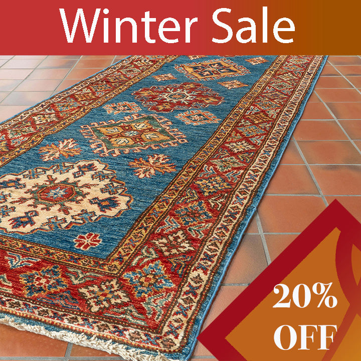 Handwoven by skilled artisan weavers in north-west Afghanistan, this fine Afghan Kazak medium runner embodies traditional craftsmanship nurtured through generations. Crafted within a cottage industry, it features vegetable-dyed, hand-spun wool known for its durability and practical resilience. The runner's blue background is accented by a red border, complemented by shades of gold, cream, and green. Its bold geometric pattern, inspired by designs originally from the Caucasus, makes it an ideal long runner for hallways, landings, or corridors, combining heritage artistry with everyday functionality.    Please click the hyperlinks below in gold for additional information.  We stock various qualities of Kazak...