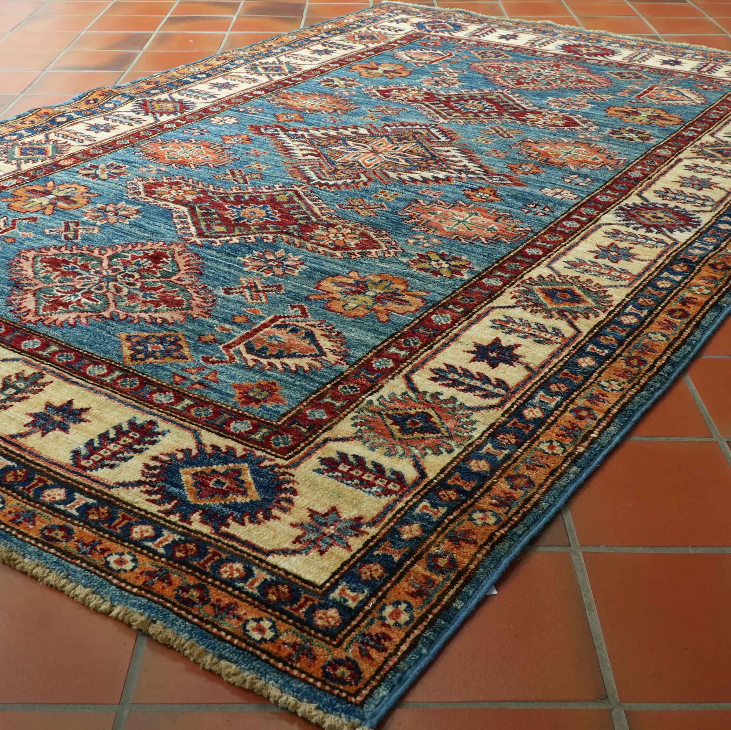 Experience the exquisite craftsmanship of our handmade, fine Afghan Kazak rug. Skilled artisans in northwest Afghanistan weave this traditional geometric design, passed down through generations. Made from vegetable-dyed handspun wool, it features striking blue, red, peach, cream, and green colours that add elegance and practicality to any space. With a beautiful lustre and fine quality, this rug is durable and timeless.