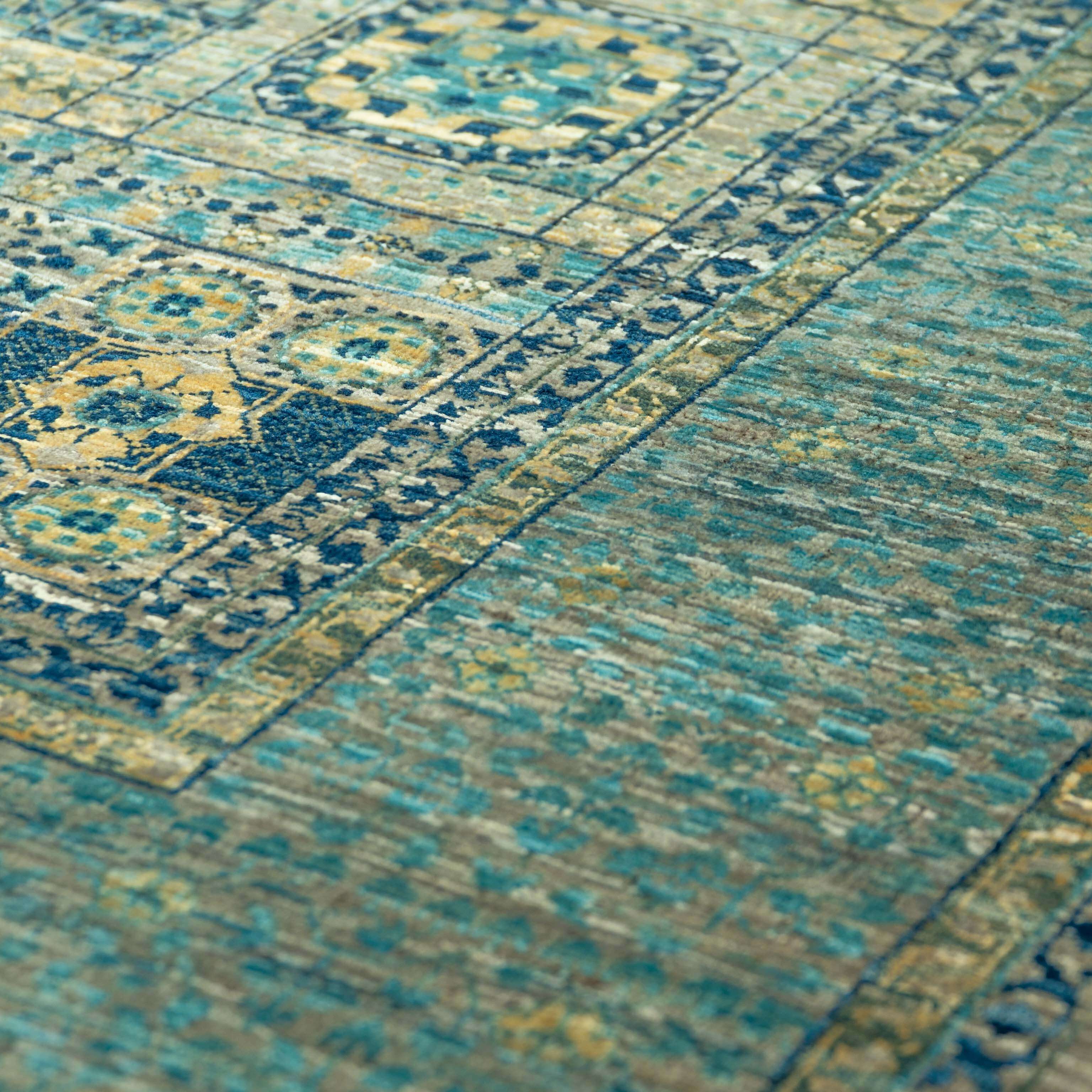 This exceptional Afghan Mamluk rug represents the pinnacle of traditional weaving craftsmanship. Handwoven by skilled artisans working within a cottage industry, each piece embodies generations of inherited expertise and time-honoured techniques. The rug features a striking central medallion design inspired by classic ancient Egyptian motifs, rendered with intricate complexity throughout. Crafted from handspun wool, dyed with natural vegetable dyes in rich blue tones accented with warm gold, the rug showcases exceptional quality through its fine knotting and dense pile. This combination of superior materials and meticulous workmanship ensures both aesthetic beauty and remarkable durability, making it a practical investment that will withstand daily use whilst retaining its character and appeal for years to come.