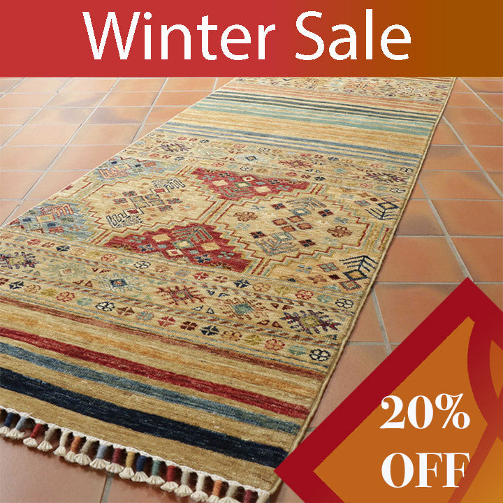 These beautiful pieces are new, appearing on the market around 2017. These wool rugs and carpets have a certain Caucasian design, similar to Kazak pieces. However, that is where the similarity ends. The rugs mostly have brightly coloured bobbin-wound fringes and no borders. Instead, the old Caucasian design is mixed into bands or stripes of bright colours. Our Afghan Samarkand rugs are handmade using naturally dyed wool on a cotton foundation. The wool used is taken from the native Karakul sheep. It is very tough and has a high natural oil content.