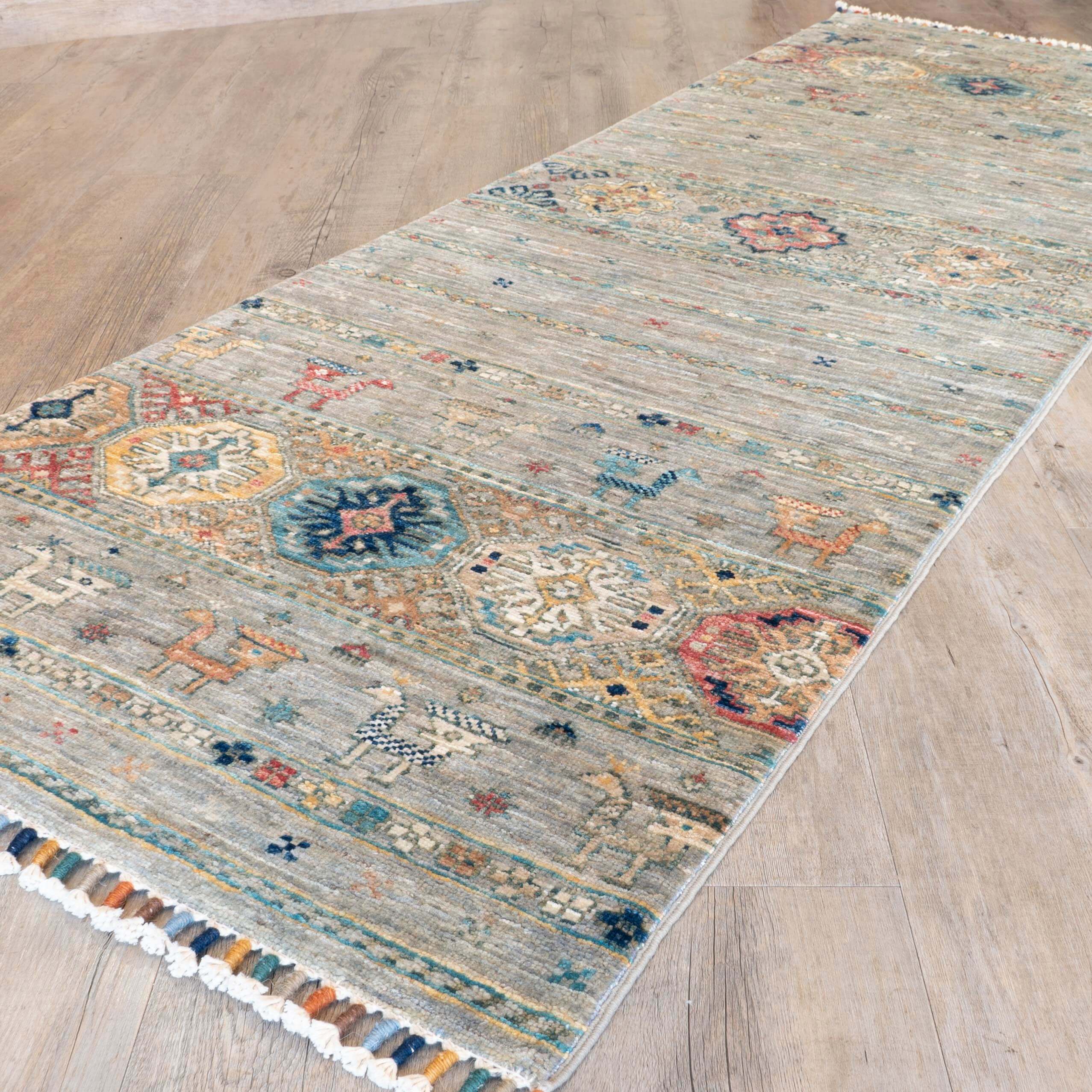 Handwoven by expert artisans in northwest Afghanistan, this fine Afghan Samarkand short runner reflects centuries-old techniques preserved through cottage industry traditions. Its durable construction ensures long-lasting use, while the sophisticated design merges classic and contemporary styles. Featuring a refined palette of muted grey, apricot, and turquoise tones, it offers a subtle yet distinctive accent for discerning interiors.