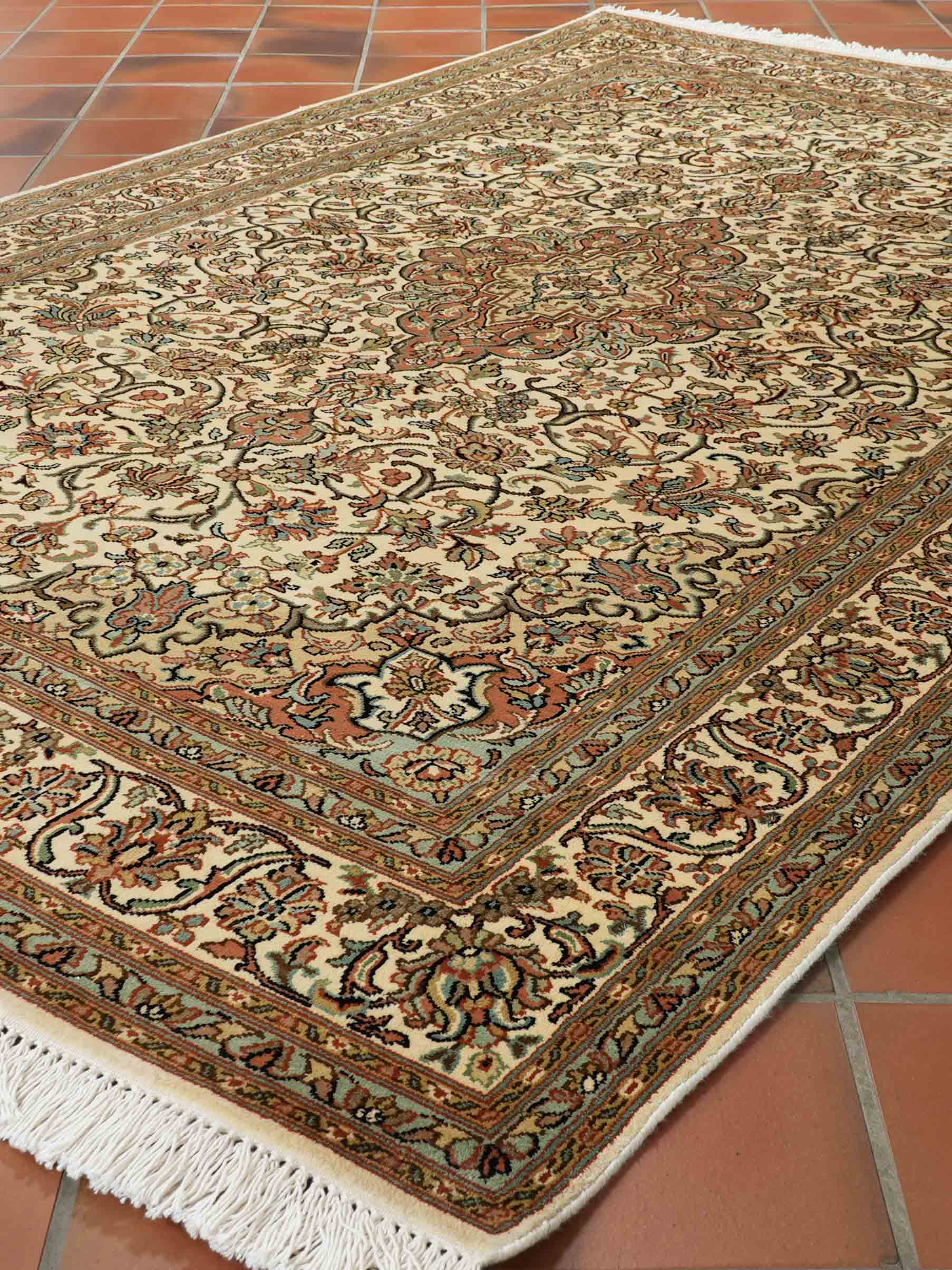 Indulge in the pure luxury of our handmade Kashmir silk rug. Crafted using an ancient technique passed down through generations, each rug features intricate patterns and a soft silk thread knotted onto a cotton foundation. The cream background with delicate shades of pink and green creates a medallion design, adding a touch of elegance to your home.