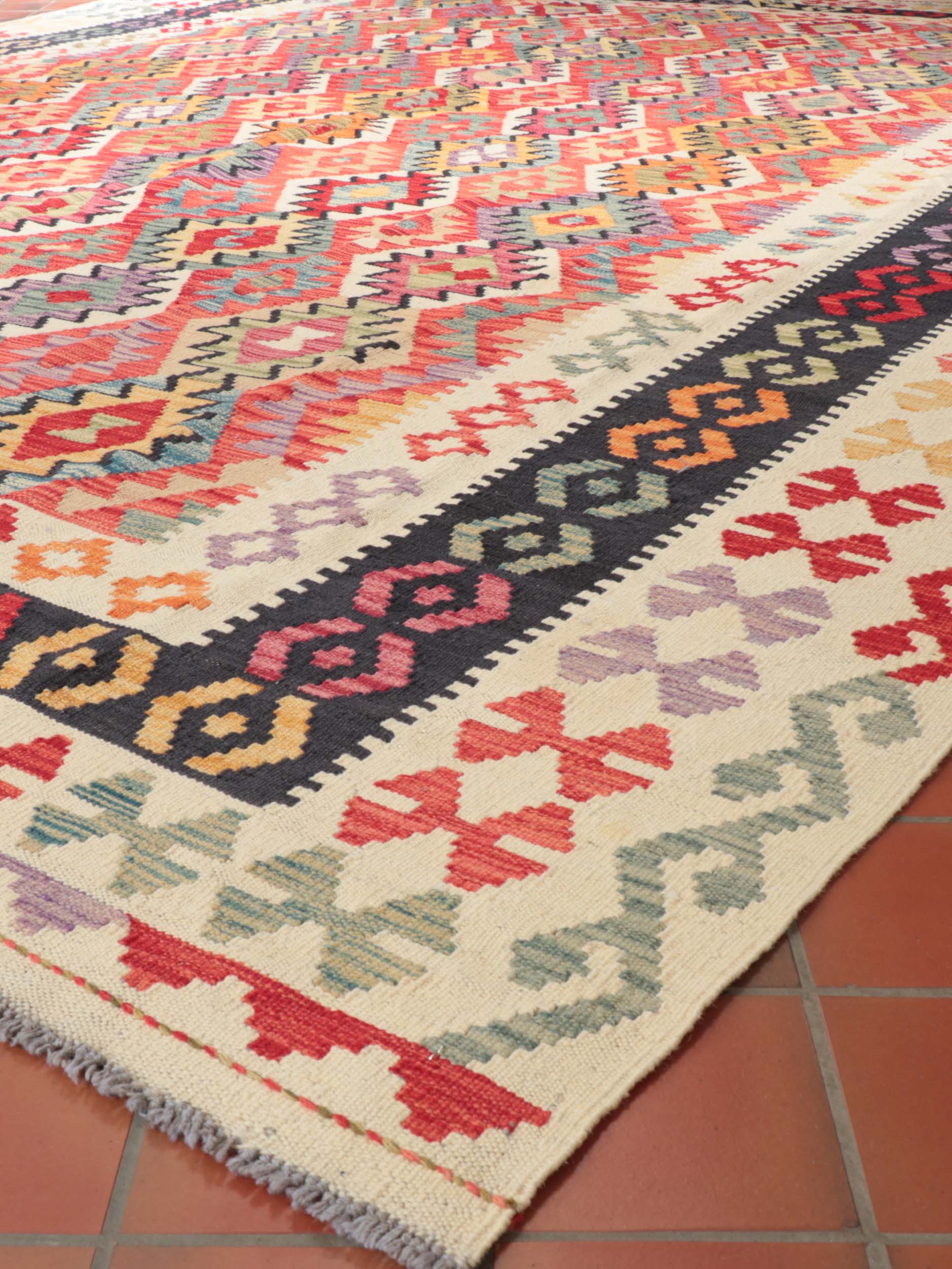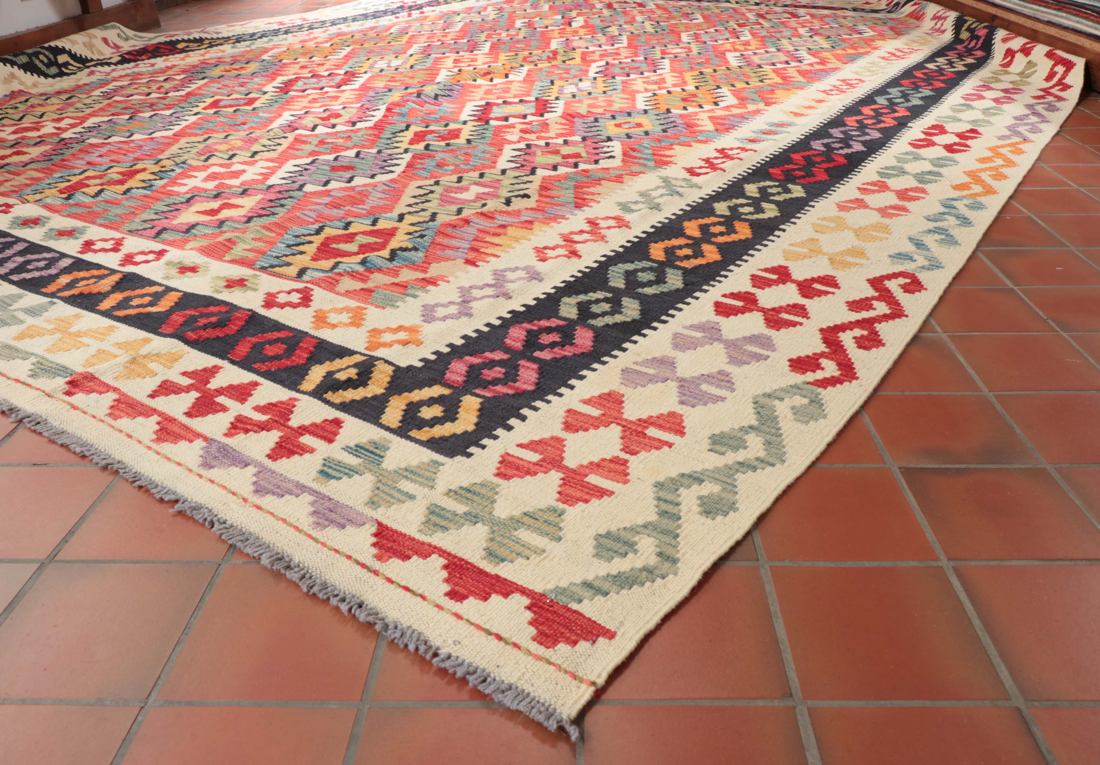 Expertly crafted in Afghanistan, this handmade oversized Afghan Kilim is a light, bright, and colourful addition to any space. Made from traditional vegetable-dyed wool, this flatweave kilim is striking in design and reversible. It works well with underfloor heating and is perfect for use on the floor or as a unique wall hanging or throw.