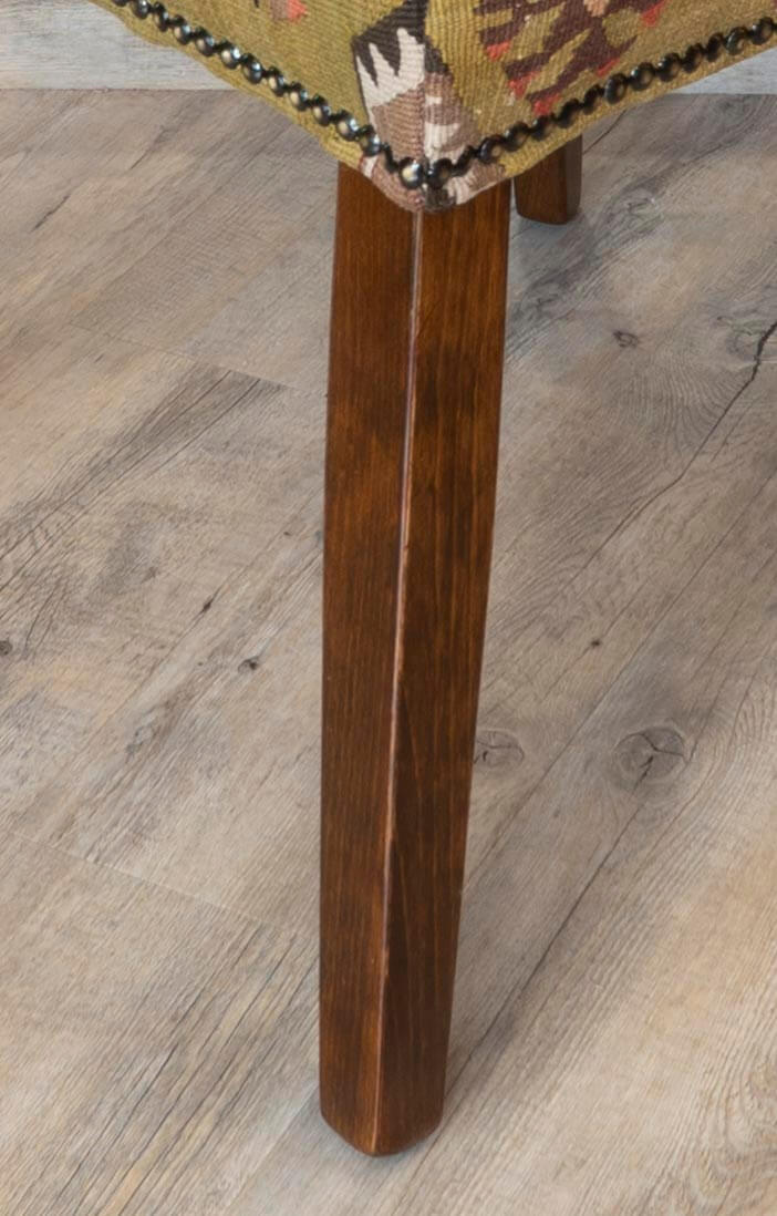 Our fully upholstered dining chairs are a timeless, classic country house design. These chairs has been covered in old Anatolian Kilim, which means it is unique; although we can make a set of chairs from one very large 'old kilim', each piece is individual and not identical; the colours will be softly faded, which can only be achieved with years of use and loving care. Often, the colours in the old kilims have toned down, and the fabric has softened, making it more malleable for working. The Kilim is cut as sympathetically as possible, ensuring that the material is shown to the best advantage possible when planning the layout of the fabric on the chair. It is surprising how much Kilim is needed to cover a frame, and every bit is used up, with the leftovers being made into cushions and draught excluded.