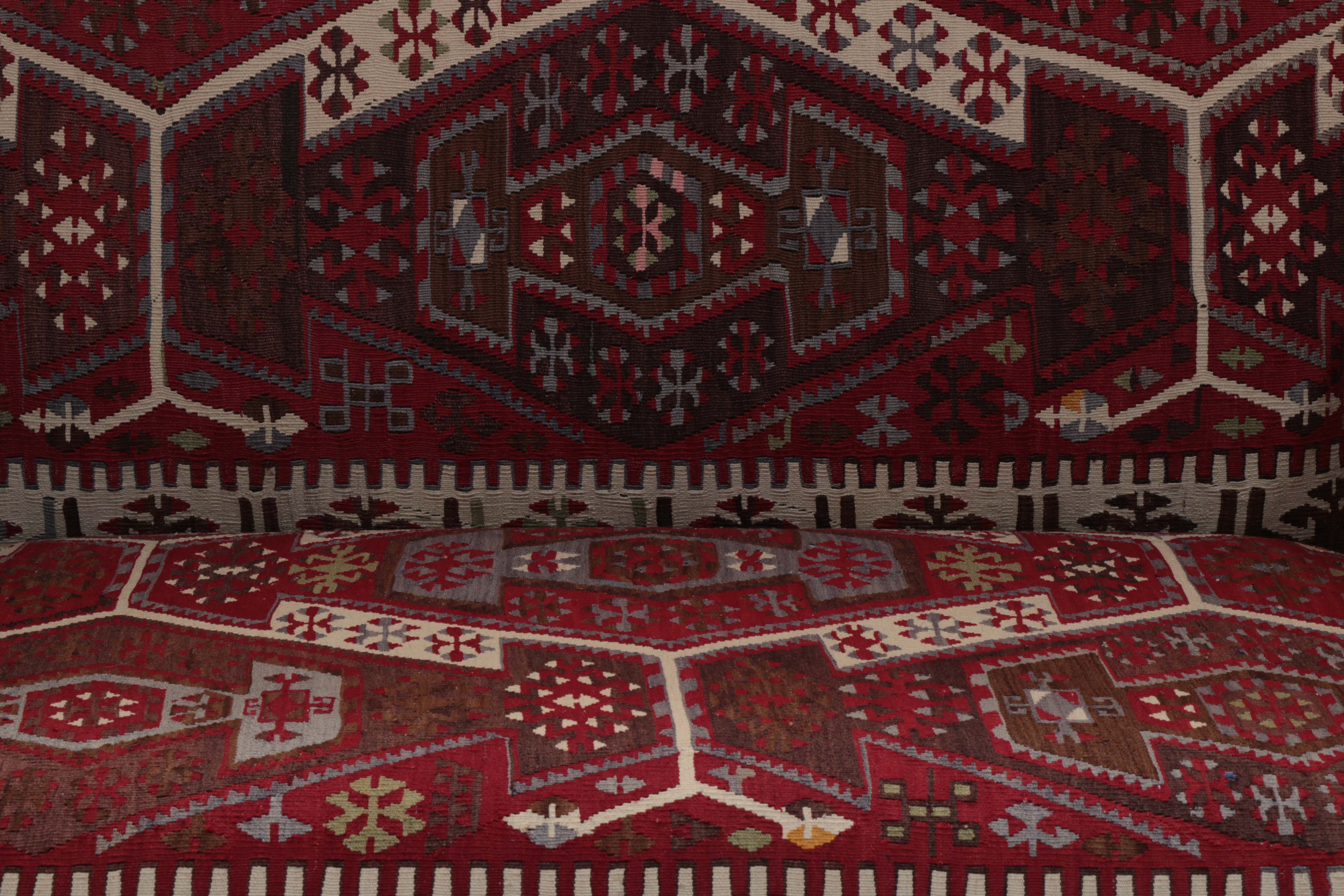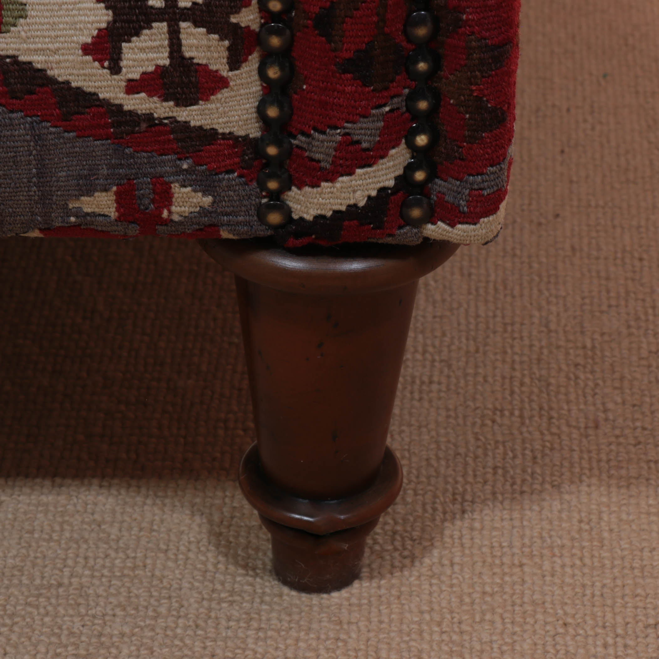 We have recently taken delivery of this magnificent Turkish kilim sofa. The rich red is mixed with cream, dark brown, steel blue and soft green in a traditional pattern. The two-seater sofa is a timeless, classic country house design. This sofa has been covered in a fine old Anatolian Kilim and is colourful, very comfortable and durable. Often, the colours in the old kilims have toned down, and the fabric has softened, making it more malleable for working. The Kilim is cut as sympathetically as possible, ensuring that the material is shown to the best advantage possible when planning the layout of the fabric on the sofa. It is surprising how much Kilim is needed to cover a frame, and every bit is used up, with the leftovers being made into cushions and draught excluders.